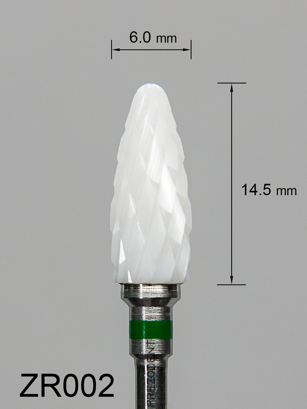 Frez ceramiczny ZR002 wypukły z grubym krzyżowym nacięciem (zielony pasek) to narzędzie do obróbki miękkich materiałów w technice dentystycznej. Wykonany z tlenku cyrkonu w kolorze białym, zapewnia skuteczne działanie bez przegrzewania powierzchni.