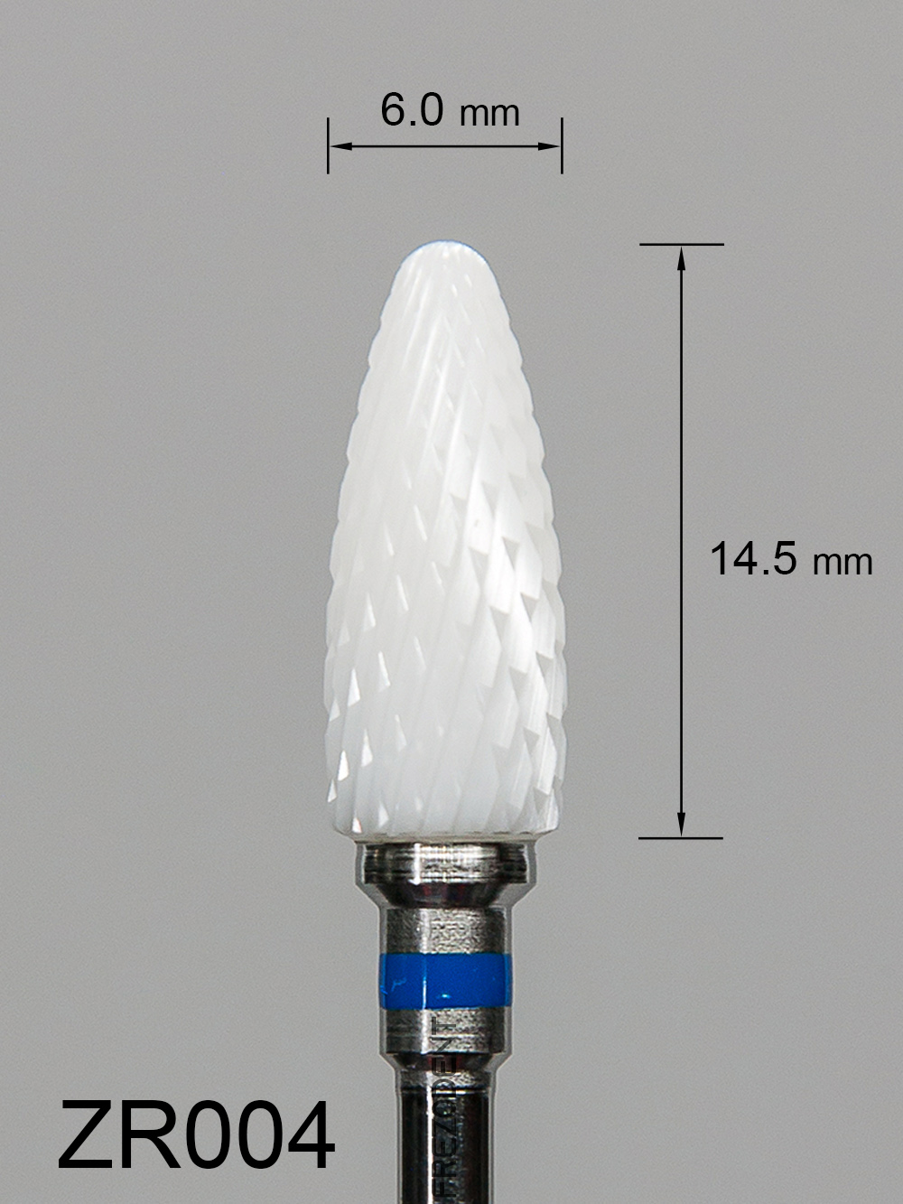 Frez ceramiczny ZR004 wypukły z średnim krzyżowym nacięciem (niebieski pasek) to narzędzie do obróbki miękkich materiałów w technice dentystycznej. Wykonany z tlenku cyrkonu w kolorze białym, zapewnia skuteczne działanie bez przegrzewania powierzchni.