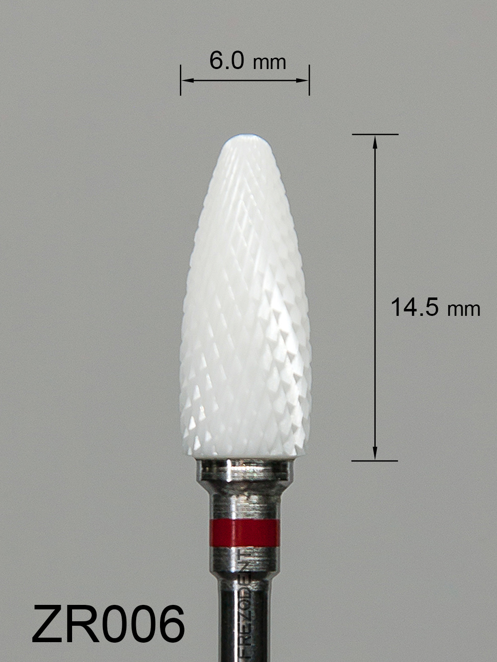 Frez ceramiczny ZR006 wypukły z drobnym krzyżowym nacięciem (czerwony pasek) to narzędzie do obróbki miękkich materiałów w technice dentystycznej. Wykonany z tlenku cyrkonu w kolorze białym, zapewnia skuteczne działanie bez przegrzewania powierzchni.