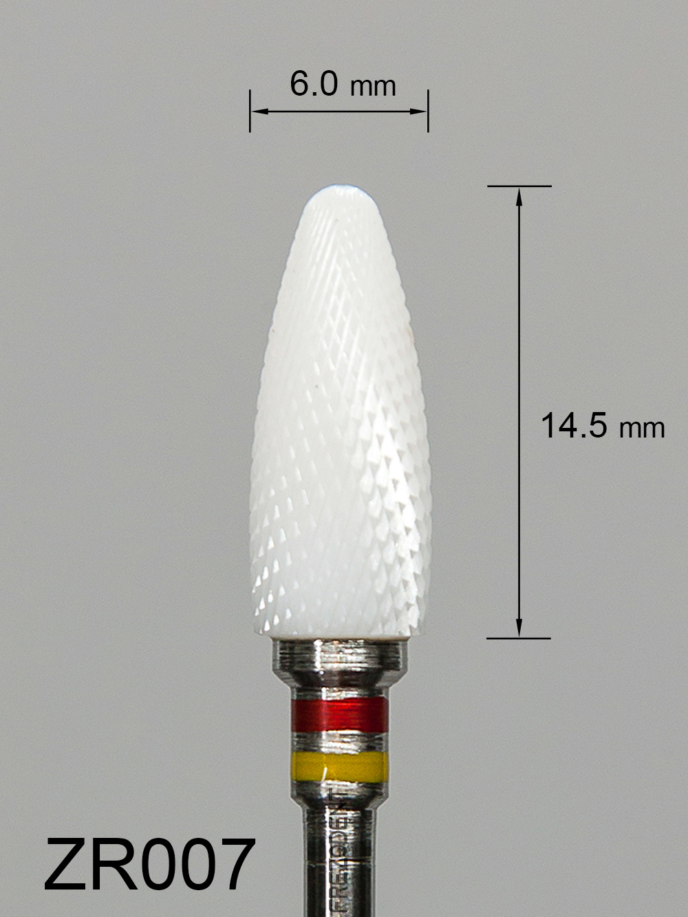 Frez ceramiczny ZR007 wypukły z drobnym krzyżowym nacięciem (czerwono-żółty pasek) to narzędzie do obróbki miękkich materiałów w technice dentystycznej. Wykonany z tlenku cyrkonu w kolorze białym, zapewnia skuteczne działanie bez przegrzewania powierzchni.