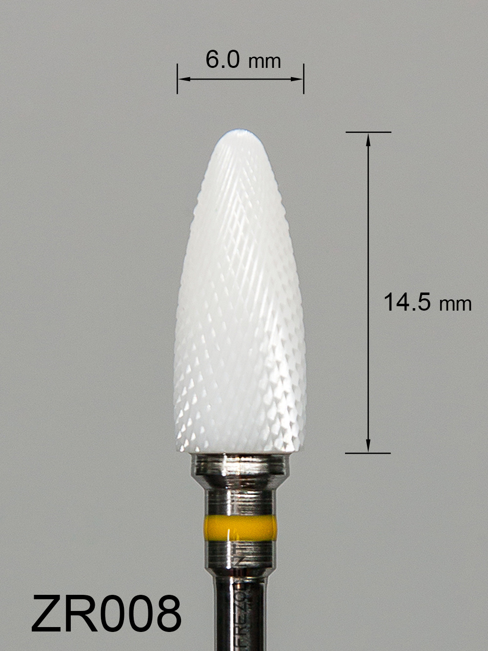 Frez ceramiczny ZR008 wypukły z bardzo drobnym krzyżowym nacięciem (żółty pasek) to narzędzie do obróbki miękkich materiałów w technice dentystycznej. Wykonany z tlenku cyrkonu w kolorze białym, zapewnia skuteczne działanie bez przegrzewania powierzchni.