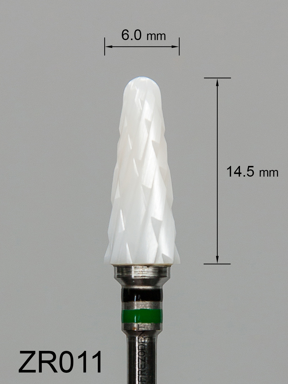 Frez ceramiczny ZR011 stożkowy z bardzo grubym krzyżowym nacięciem (czarno-zielony pasek) to narzędzie do obróbki miękkich materiałów w technice dentystycznej. Wykonany z tlenku cyrkonu w kolorze białym, zapewnia skuteczne działanie bez przegrzewania powierzchni.