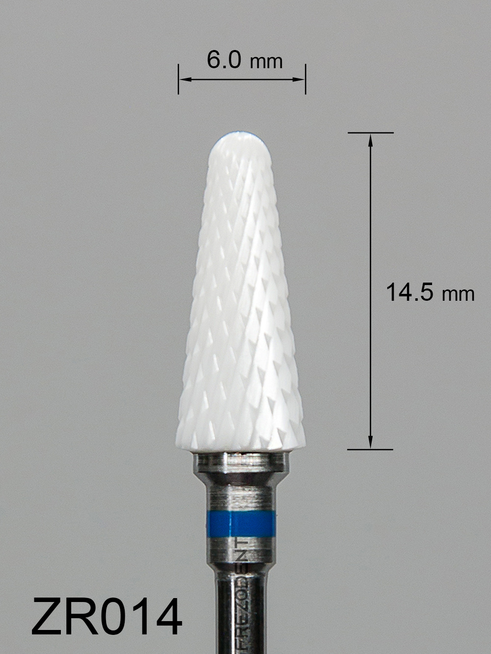 Frez ceramiczny ZR014 stożkowy z średnim krzyżowym nacięciem (niebieski pasek) to narzędzie do obróbki miękkich materiałów w technice dentystycznej. Wykonany z tlenku cyrkonu w kolorze białym, zapewnia skuteczne działanie bez przegrzewania powierzchni.