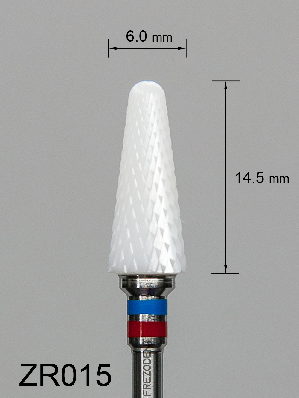 Frez ceramiczny ZR015 stożkowy z krzyżowym nacięciem (niebiesko-czerwony pasek) to narzędzie do obróbki miękkich materiałów w technice dentystycznej. Wykonany z tlenku cyrkonu w kolorze białym, zapewnia skuteczne działanie bez przegrzewania powierzchni.