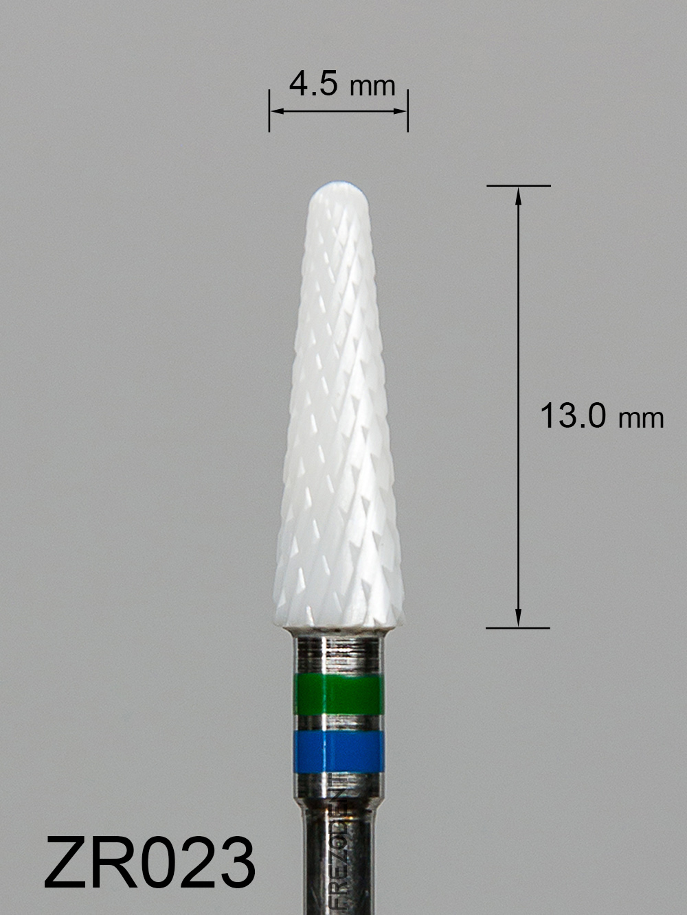 Frez ceramiczny ZR023 stożkowy z średnio-grubym krzyżowym nacięciem (zielono-niebieski pasek) to narzędzie do obróbki miękkich materiałów w technice dentystycznej. Wykonany z tlenku cyrkonu w kolorze białym, zapewnia skuteczne działanie bez przegrzewania powierzchni.