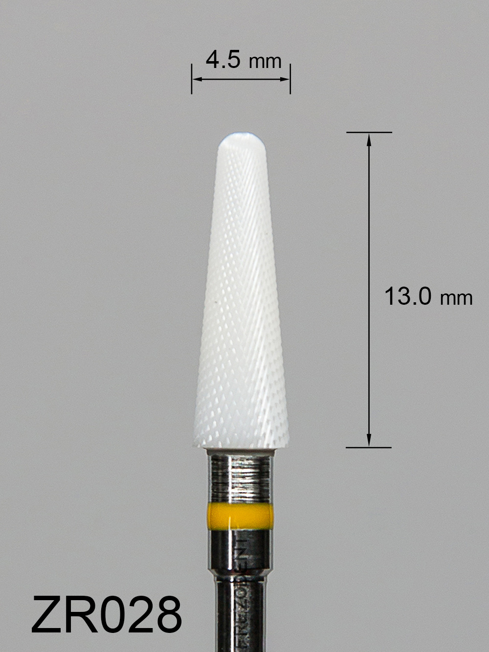 Frez ceramiczny ZR028 stożkowy z bardzo drobnym krzyżowym nacięciem (żółty pasek) to narzędzie do obróbki miękkich materiałów w technice dentystycznej. Wykonany z tlenku cyrkonu w kolorze białym, zapewnia skuteczne działanie bez przegrzewania powierzchni.