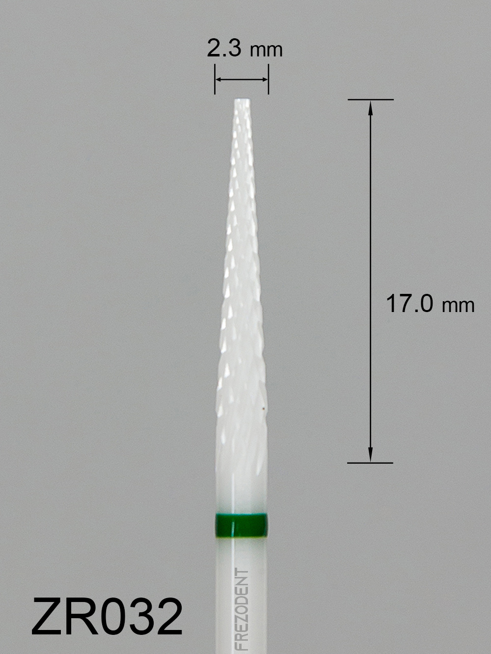 Frez ceramiczny ZR032 długi stożkowy z grubym krzyżowym nacięciem (zielony pasek) to narzędzie do obróbki miękkich materiałów w technice dentystycznej. Wykonany z tlenku cyrkonu w kolorze białym, zapewnia skuteczne działanie bez przegrzewania powierzchni.