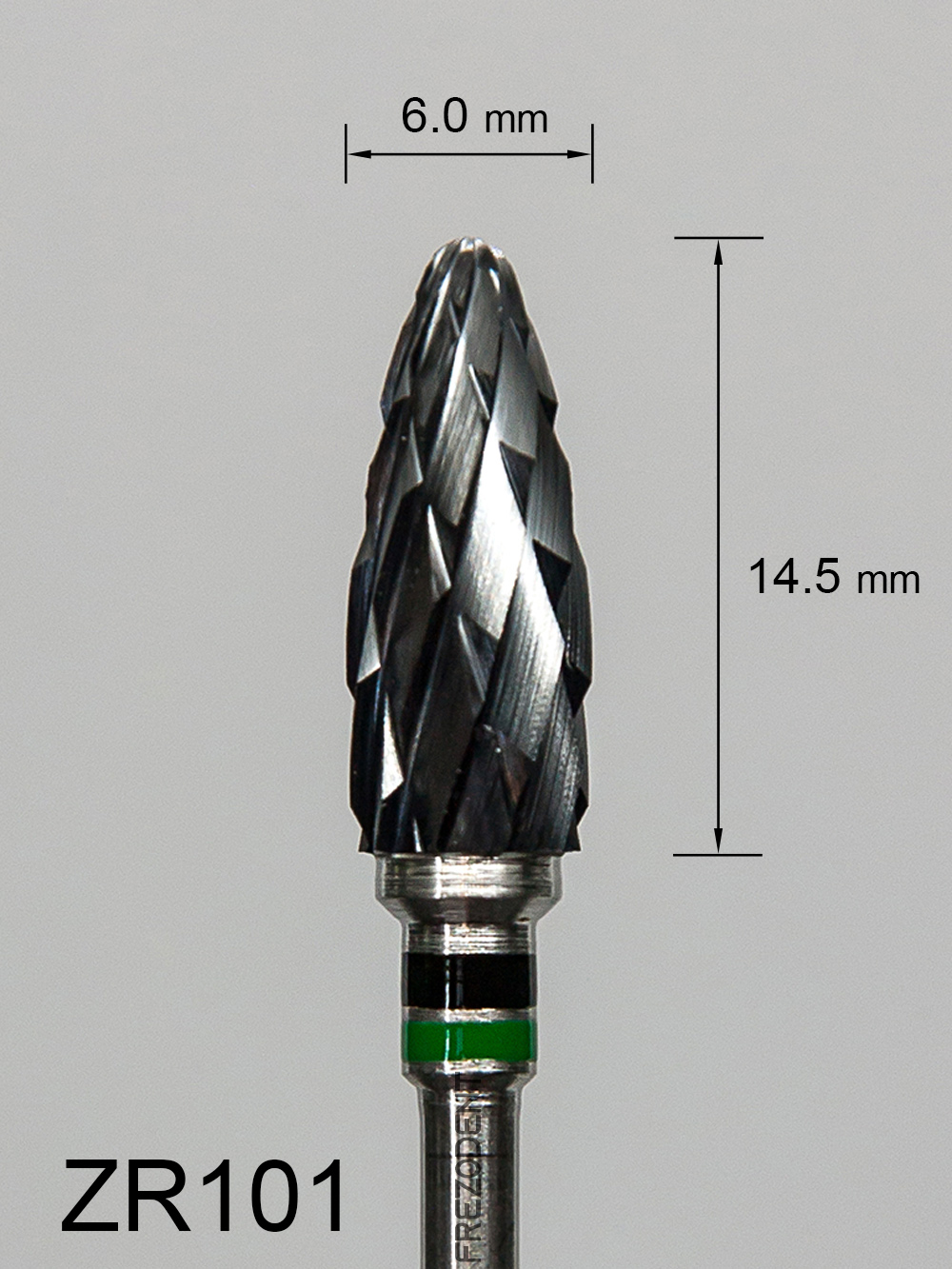 Frez ceramiczny ZR101 wypukły z bardzo grubym krzyżowym nacięciem (czarno-zielony pasek) to narzędzie do obróbki miękkich materiałów w technice dentystycznej. Wykonany z tlenku cyrkonu w kolorze czarnym, zapewnia skuteczne działanie bez przegrzewania powierzchni.