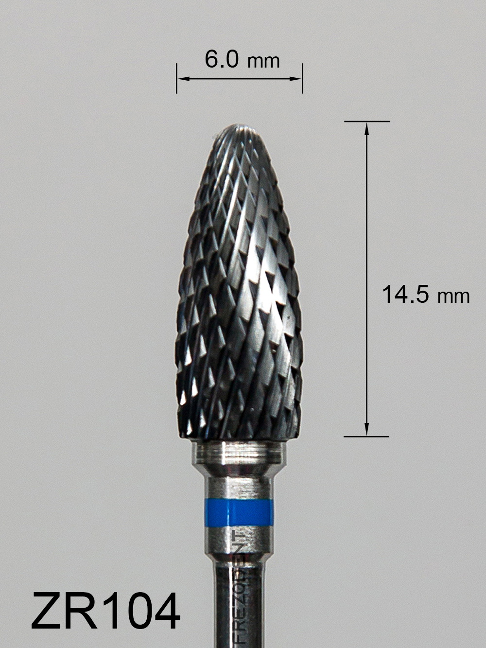 Frez ceramiczny ZR104 wypukły z średnim krzyżowym nacięciem (niebieski pasek) to narzędzie do obróbki miękkich materiałów w technice dentystycznej. Wykonany z tlenku cyrkonu w kolorze czarnym, zapewnia skuteczne działanie bez przegrzewania powierzchni.
