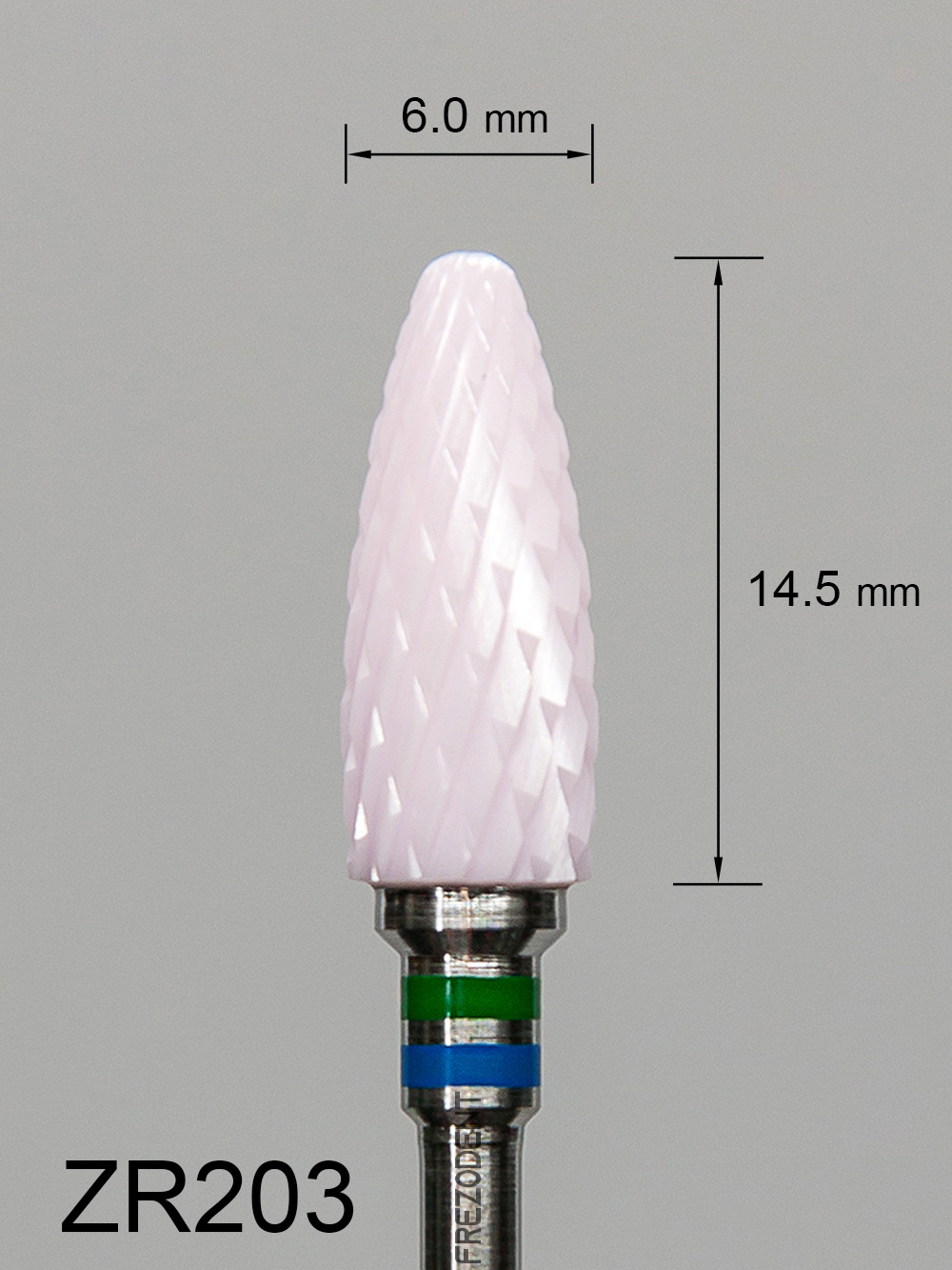 Frez ceramiczny ZR203 wypukły z średnio-grubym krzyżowym nacięciem (zielono-niebieski pasek) to narzędzie do obróbki miękkich materiałów w technice dentystycznej. Wykonany z tlenku cyrkonu w kolorze różowym, zapewnia skuteczne działanie bez przegrzewania powierzchni.