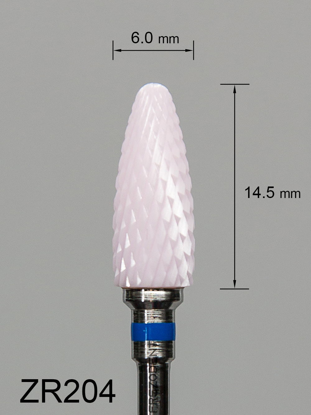 Frez ceramiczny ZR204 wypukły z średnim krzyżowym nacięciem (niebieski pasek) to narzędzie do obróbki miękkich materiałów w technice dentystycznej. Wykonany z tlenku cyrkonu w kolorze różowym, zapewnia skuteczne działanie bez przegrzewania powierzchni.