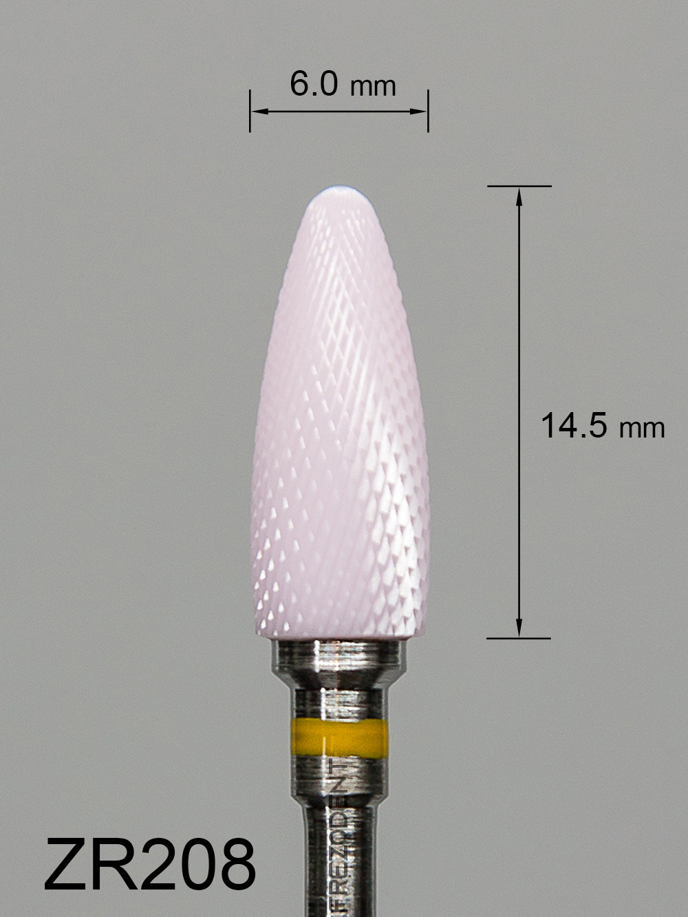 Frez ceramiczny ZR208 wypukły z bardzo drobnym krzyżowym nacięciem (żółty pasek) to narzędzie do obróbki miękkich materiałów w technice dentystycznej. Wykonany z tlenku cyrkonu w kolorze różowym, zapewnia skuteczne działanie bez przegrzewania powierzchni.