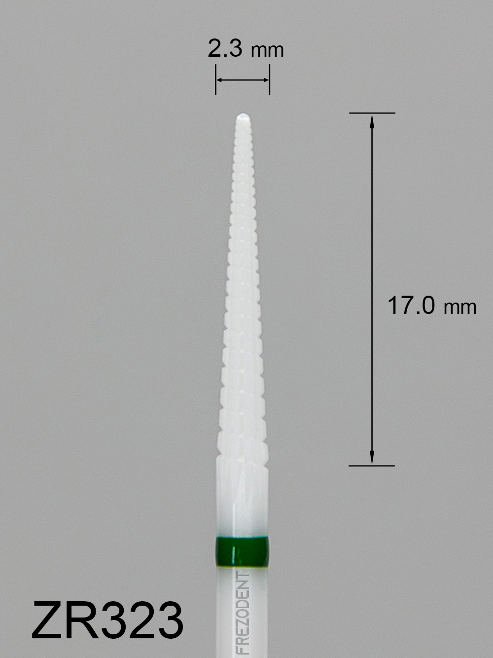 Frez ceramiczny ZR323 długi stożkowy z grubym poprzecznym nacięciem (zielony pasek) to narzędzie do obróbki miękkich materiałów w technice dentystycznej. Wykonany z tlenku cyrkonu w kolorze różowym, zapewnia skuteczne działanie bez przegrzewania powierzchni.