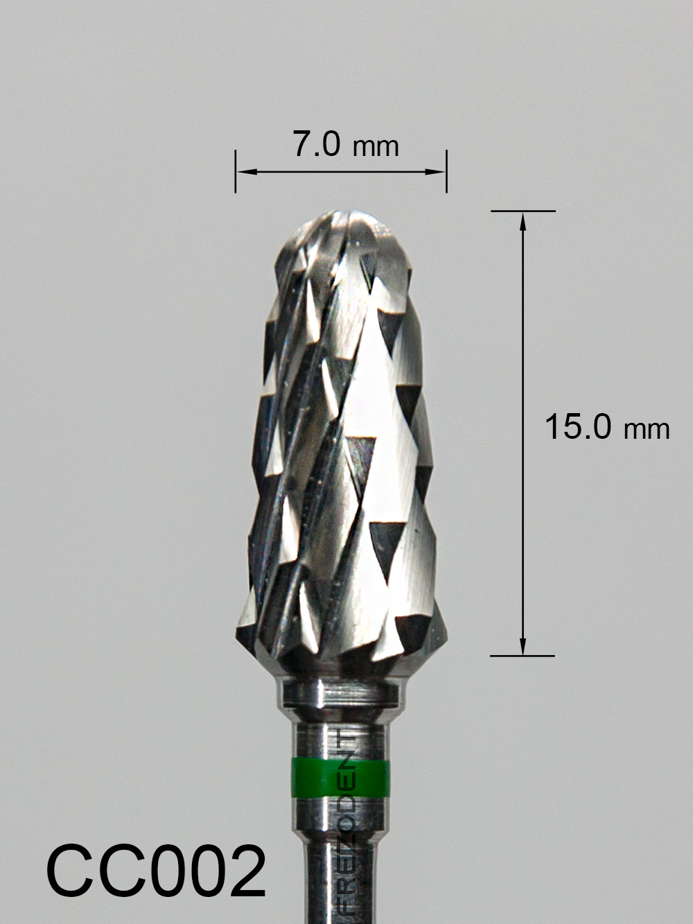 Profesjonalny frez protetyczny z serii CC (Coarse Cross) charakteryzujący się agresywnym, grubym krzyżowym nacięciem (oznaczenie zielonym paskiem). Jest to narzędzie stworzone do maksymalnie szybkiego usuwania materiału w laboratorium, ze szczególnym uwzględnieniem obróbki konturowej. Kształt stożka o średnicy roboczej 7,0 mm i długości roboczej 15,0 mm w połączeniu z agresywnym nacięciem sprawia, że jest idealny do:✅ Zastosowanie: