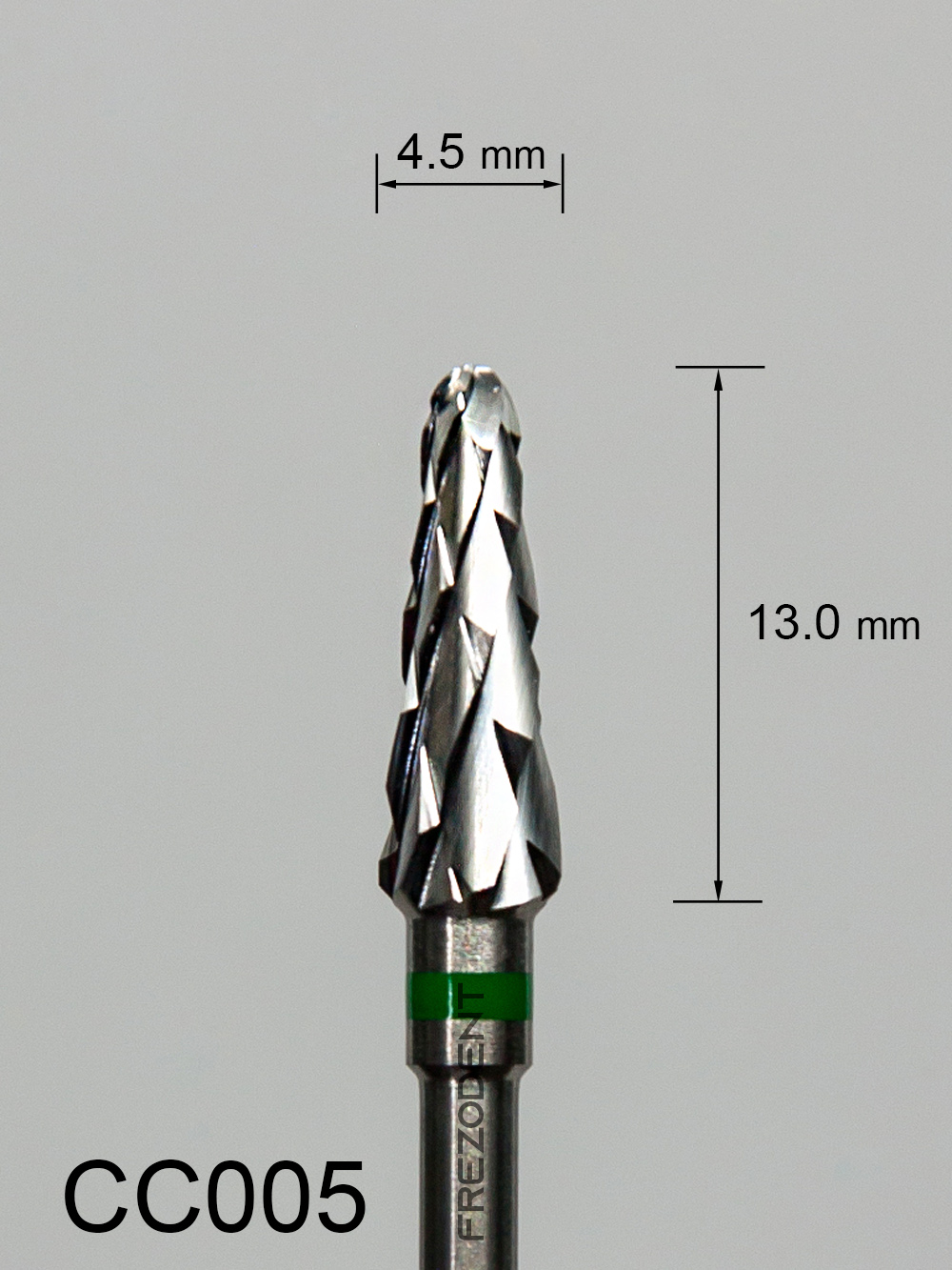 Frez węglikowy CC005 z grubym krzyżowym nacięciem (zielony pasek) – kształt stożkowy.