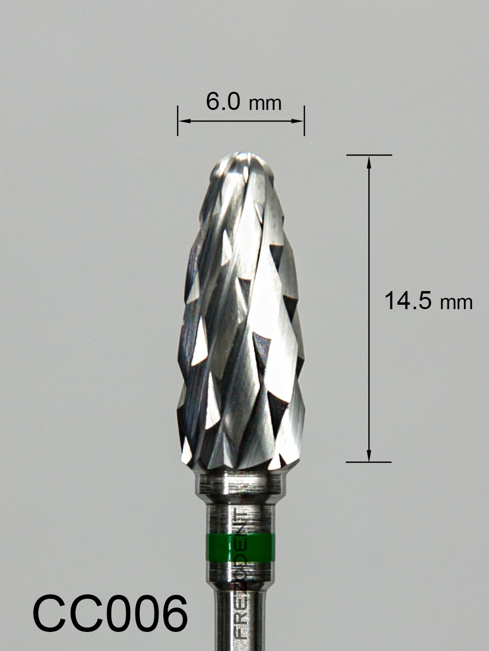 Profesjonalny frez protetyczny z serii CC charakteryzujący się agresywnym, grubym krzyżowym nacięciem (oznaczenie zielonym paskiem). Jest to narzędzie stworzone do maksymalnie szybkiego usuwania materiału w laboratorium. Kształt wypukły (soczewkowy) o średnicy roboczej 6,0 mm i długości roboczej 14,5 mm w połączeniu z agresywnym nacięciem sprawia, że jest idealny do:✅ Zastosowanie:
