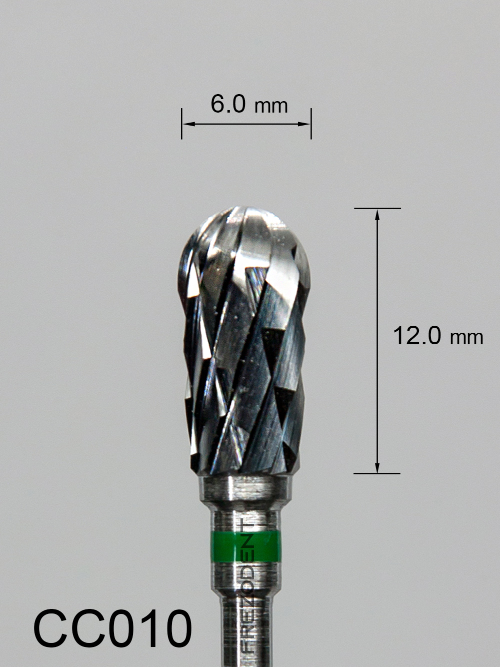 Frez węglikowy CC010 z grubym krzyżowym nacięciem (zielony pasek) – kształt odwróconej gruszki.