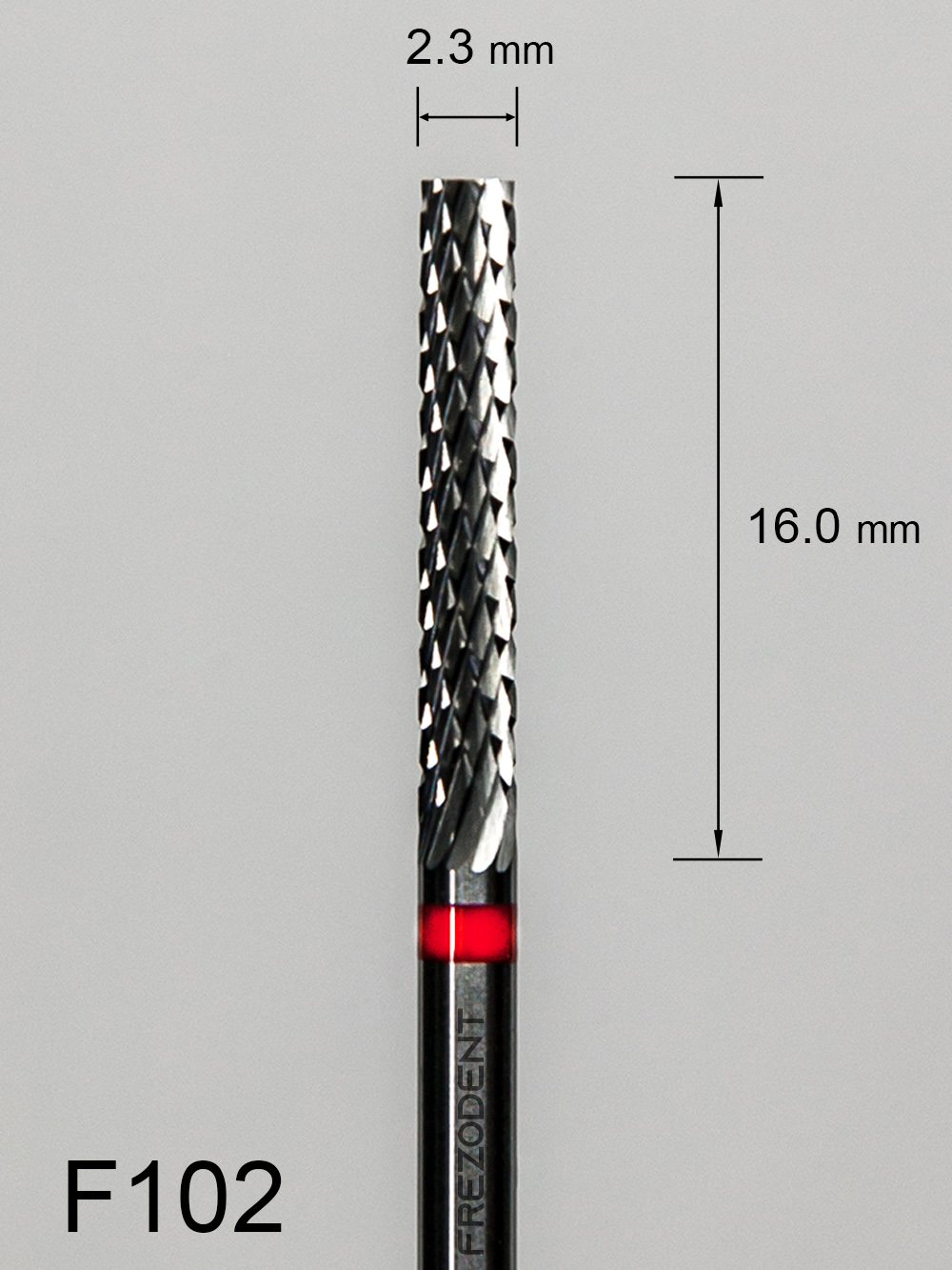 Frez węglikowy F102 – kształt walcowy z płaską końcówką, z drobnym krzyżowym nacięciem (czerwony pasek).