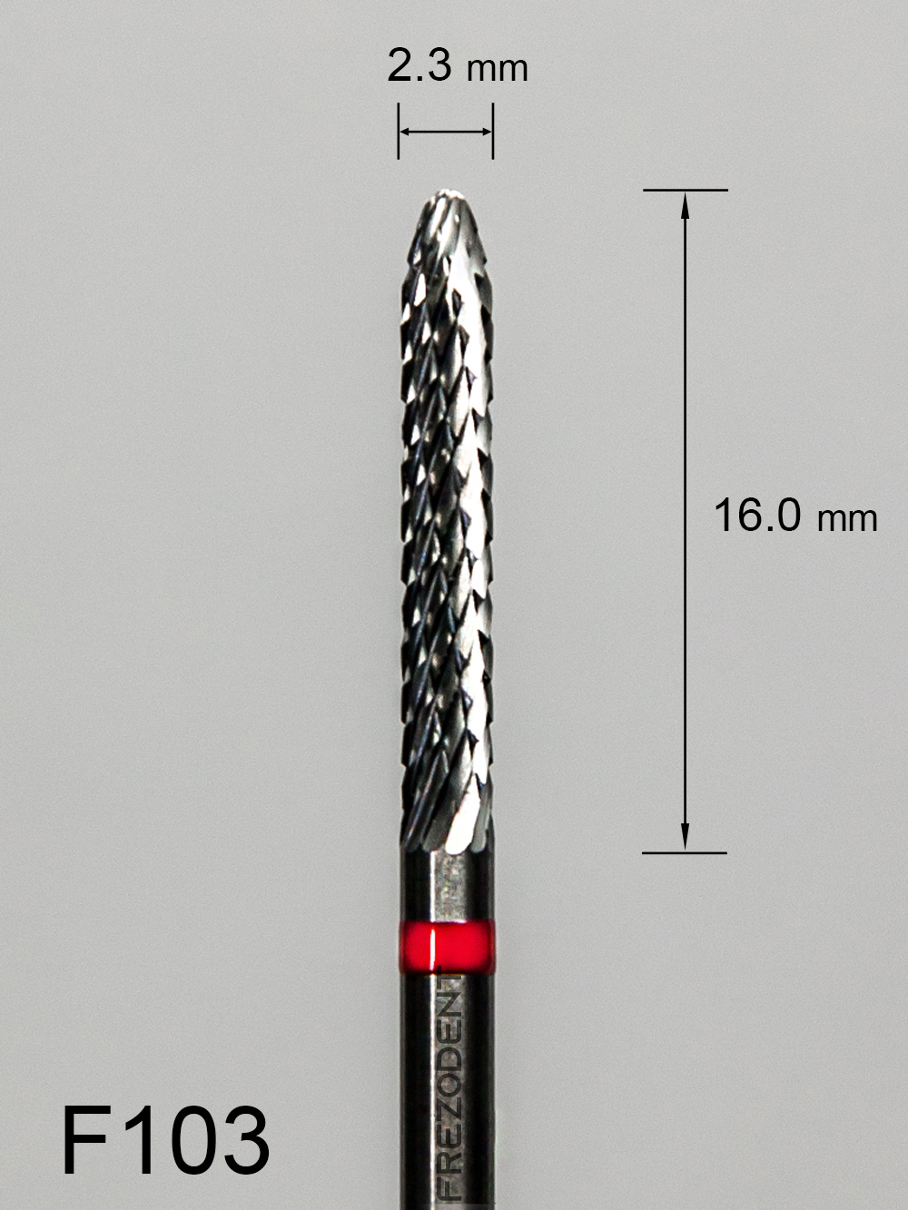 Frez węglikowy F103 – kształt walcowy ze zwężającą się końcówką, z drobnym krzyżowym nacięciem (czerwony pasek).