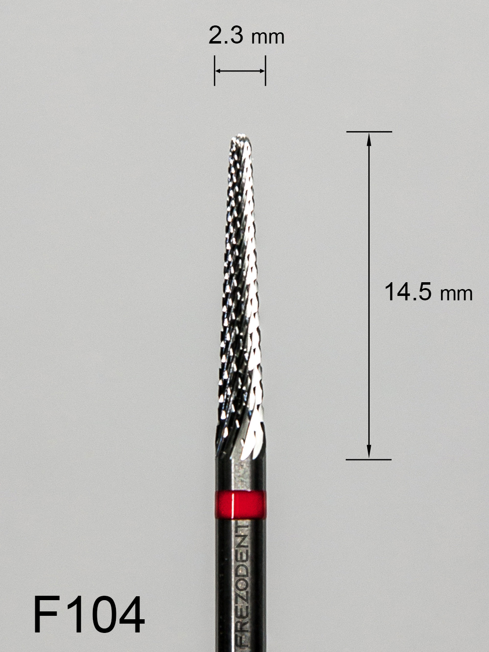 Frez węglikowy F104 – kształt stożkowy z zaokrągloną końcówką, z drobnym krzyżowym nacięciem (czerwony pasek).
