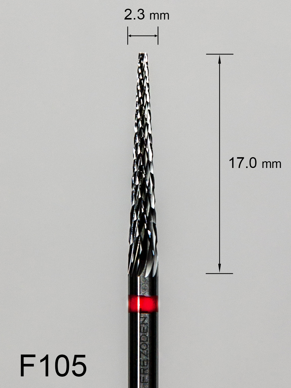 Frez węglikowy F105 – kształt długi stożkowy z ostrą końcówką, z drobnym krzyżowym nacięciem (czerwony pasek).