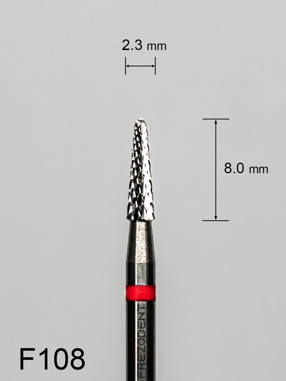 Frez węglikowy F108 – kształt stożkowy z zaokrągloną końcówką, z drobnym krzyżowym nacięciem (czerwony pasek).