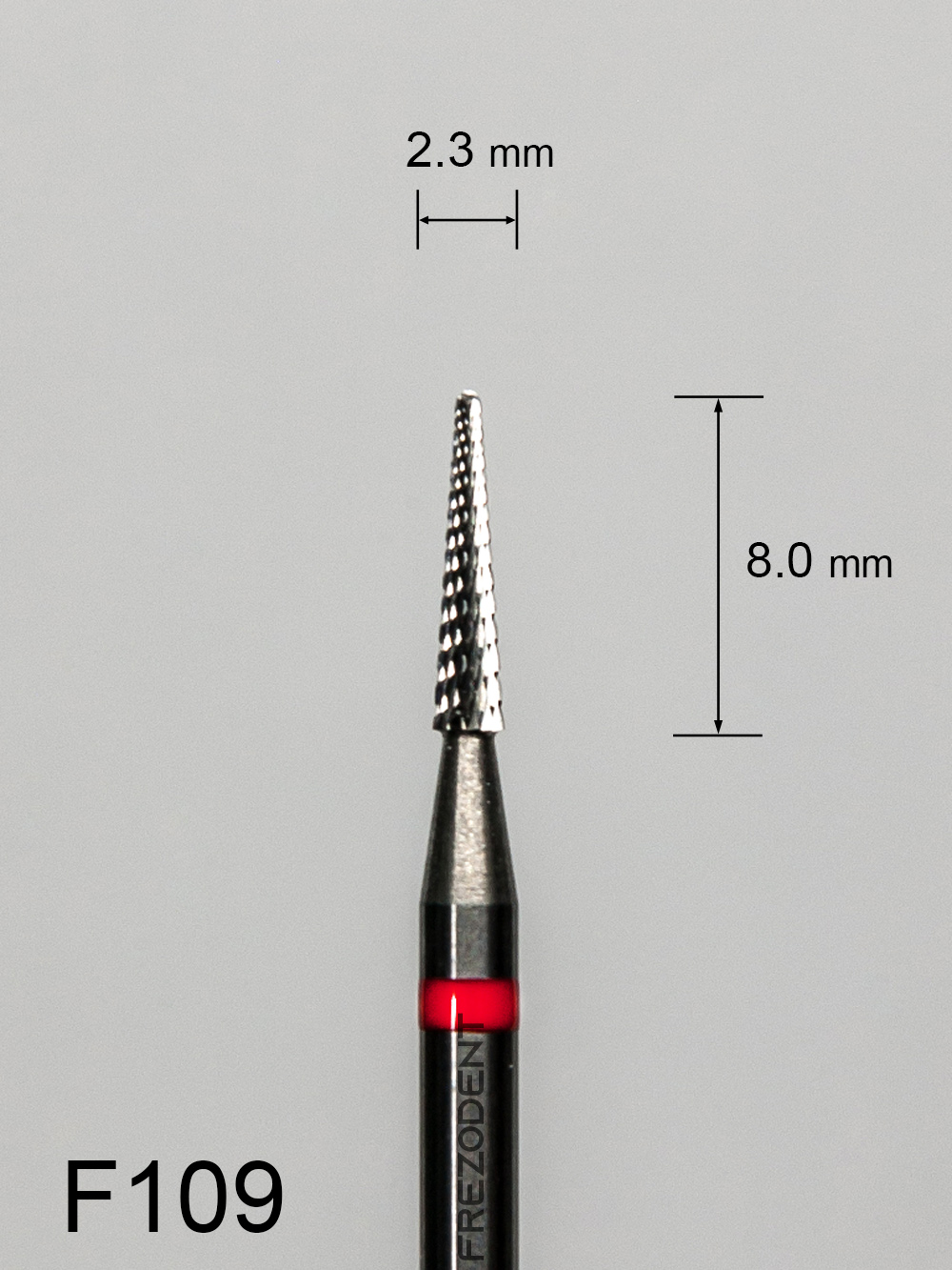 Frez węglikowy F109 – kształt chudy stożkowy z zaokrągloną końcówką, z drobnym krzyżowym nacięciem (czerwony pasek).