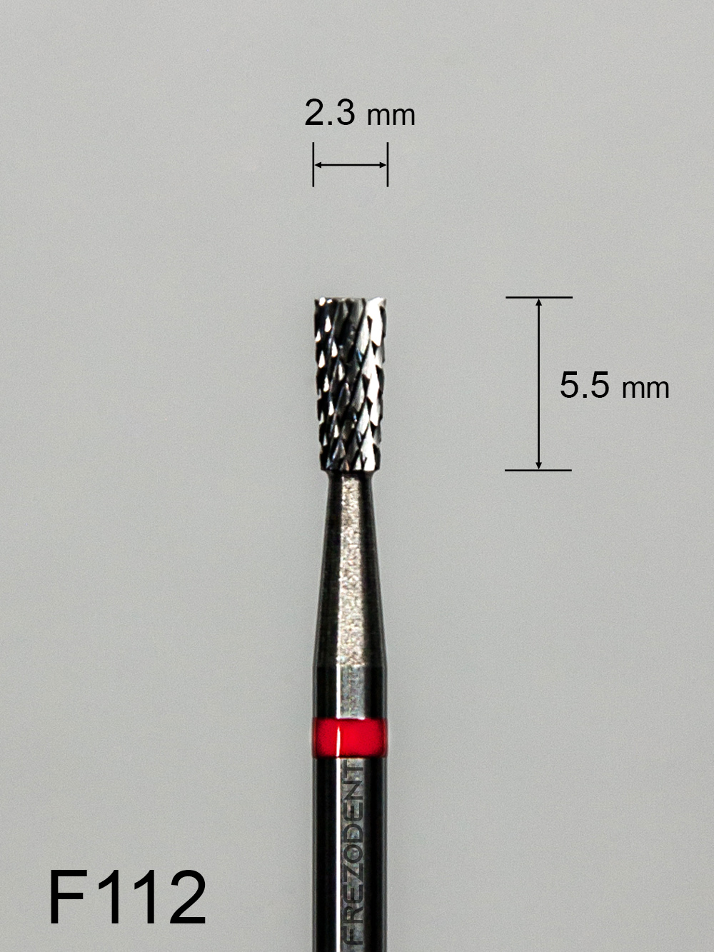 Frez węglikowy F112 – kształt stożek odwrócony, z drobnym krzyżowym nacięciem (czerwony pasek).