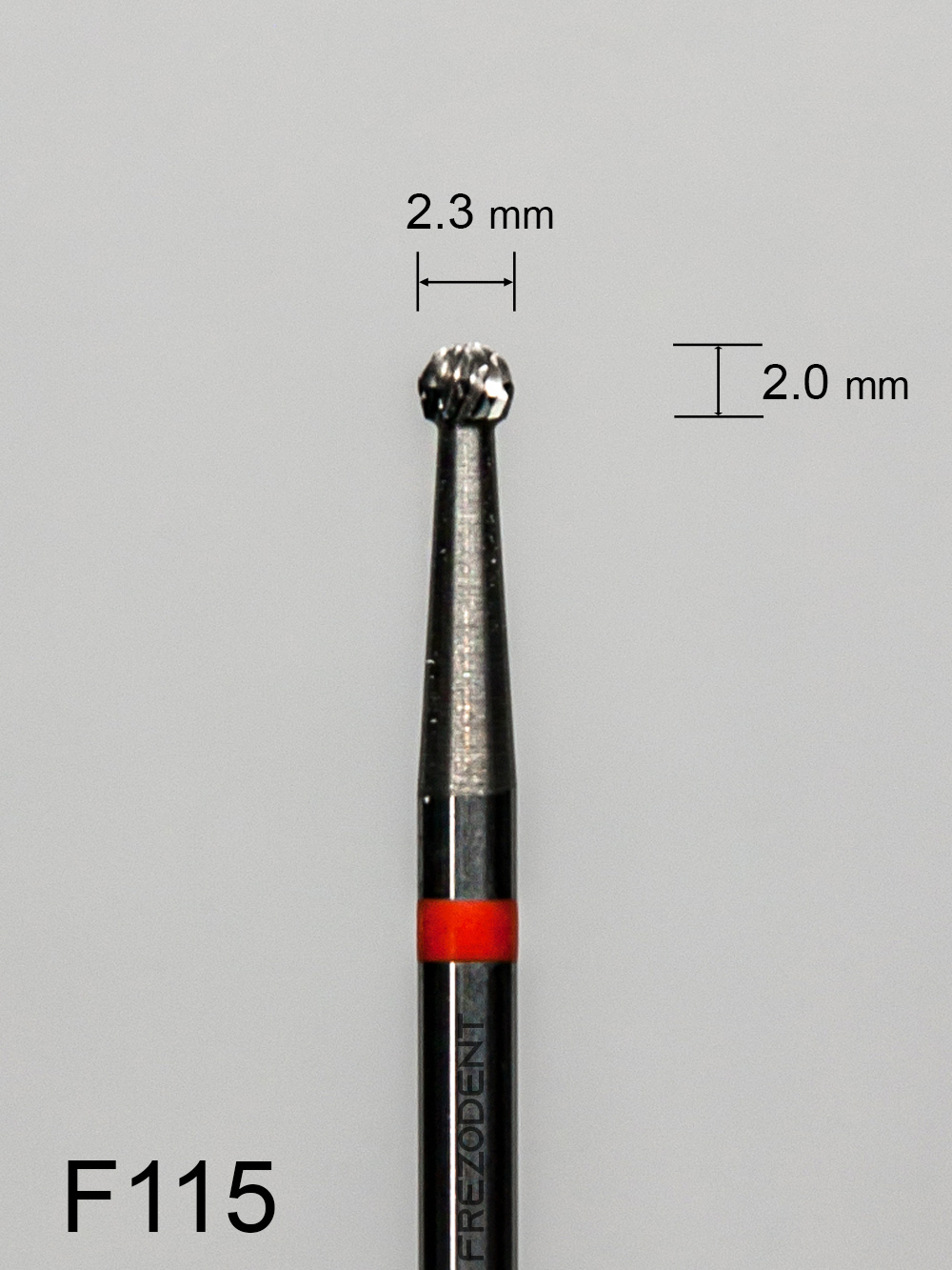 Frez węglikowy F115 – kształt kulkowy, z drobnym krzyżowym nacięciem (czerwony pasek).