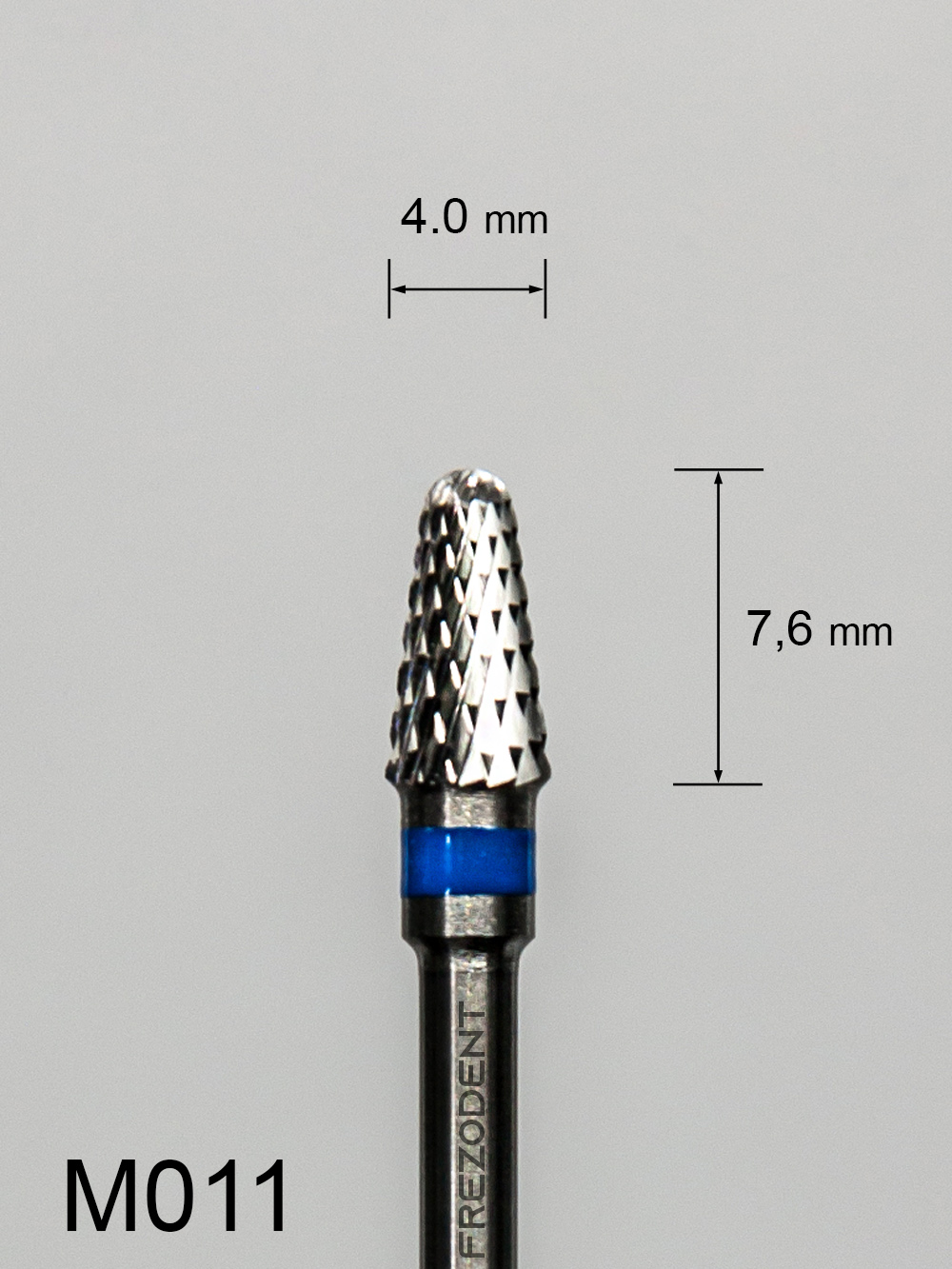 Profesjonalny frez protetyczny o stożkowym kształcie i skróconej części roboczej, stworzony do precyzyjnego modelowania i finiszowania w technice dentystycznej. Model M011 posiada krzyżowe średnie nacięcie (oznaczone niebieskim paskiem), które zapewnia efektywne i kontrolowane skrawanie materiału. Krótka długość robocza (7,6 mm) w połączeniu ze średnicą 4,0 mm gwarantuje maksymalną stabilność pracy i minimalizuje ryzyko wibracji, co jest kluczowe przy delikatniejszym konturowaniu.Dzięki stożkowemu kształtowi i kompaktowym wymiarom, ten frez do metalu i akrylu jest idealny do opracowywania detali, finiszowania krawędzi oraz precyzyjnego usuwania nadlewów w płytkich lub ograniczonych przestrzeniach. Jest to kluczowe narzędzie do uzyskania wysokiej estetyki pracy.