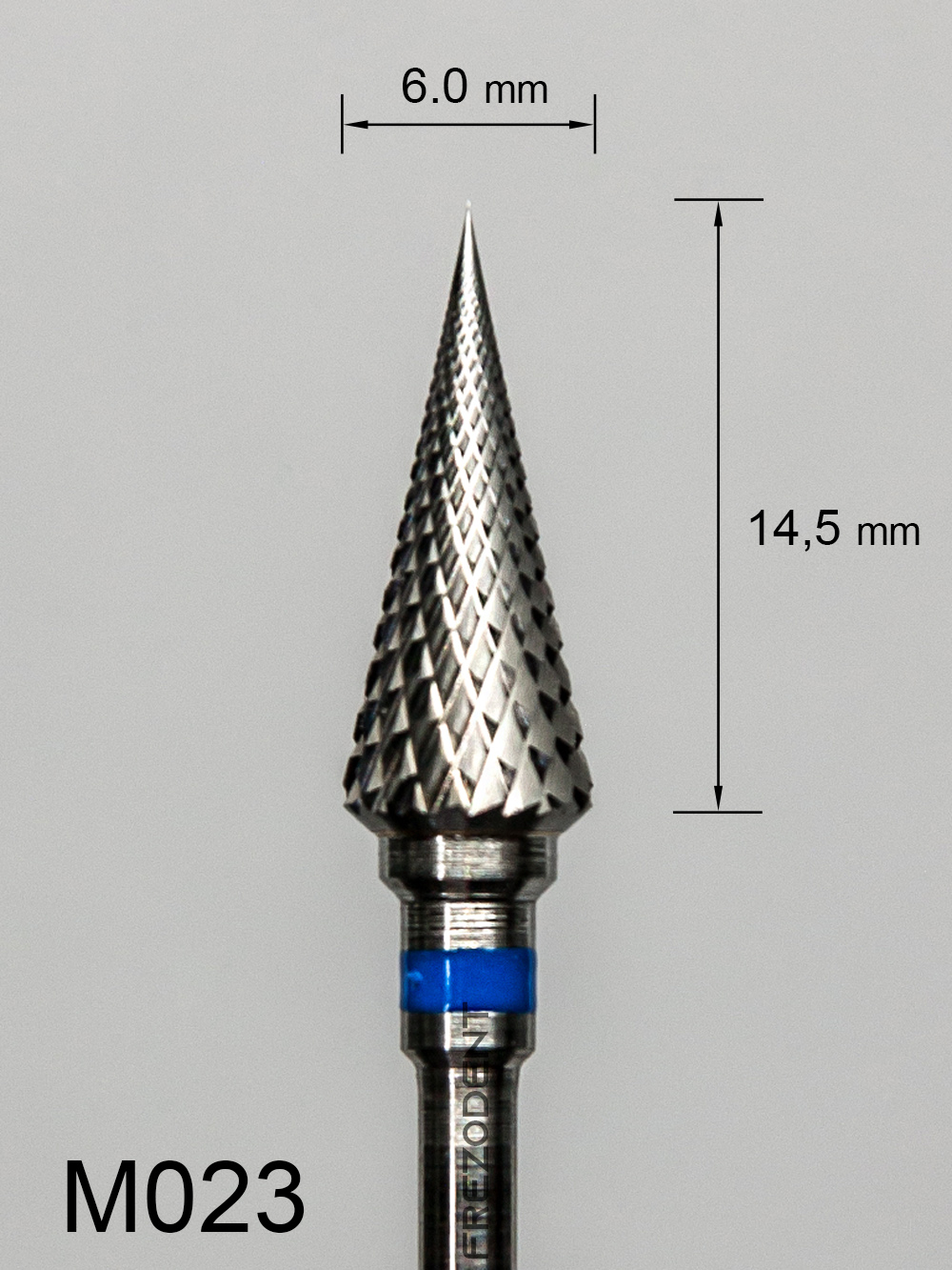 Profesjonalny frez protetyczny o kształcie stożkowym, stworzony do wszechstronnej i zaawansowanej pracy z twardymi materiałami, takimi jak stopy protetyczne i akryl. Model M023 posiada krzyżowe średnie nacięcie (oznaczone niebieskim paskiem), które zapewnia agresywne, ale stabilne skrawanie materiału. Wydłużona część robocza (14,5 mm) w połączeniu z ostrym czubkiem czyni go wyjątkowo precyzyjnym i wydajnym narzędziem.Dzięki stożkowemu kształtowi ("choinkowemu") oraz bardzo ostremu czubkowi, ten frez do metalu i akrylu jest niezastąpiony przy obróbce wewnętrznej stron podbudów, precyzyjnym nacinaniu bruzd oraz usuwaniu materiału z narożników i detali. Kształt ten ułatwia szybkie skracanie materiału i kontrolę nad głębokością obróbki.