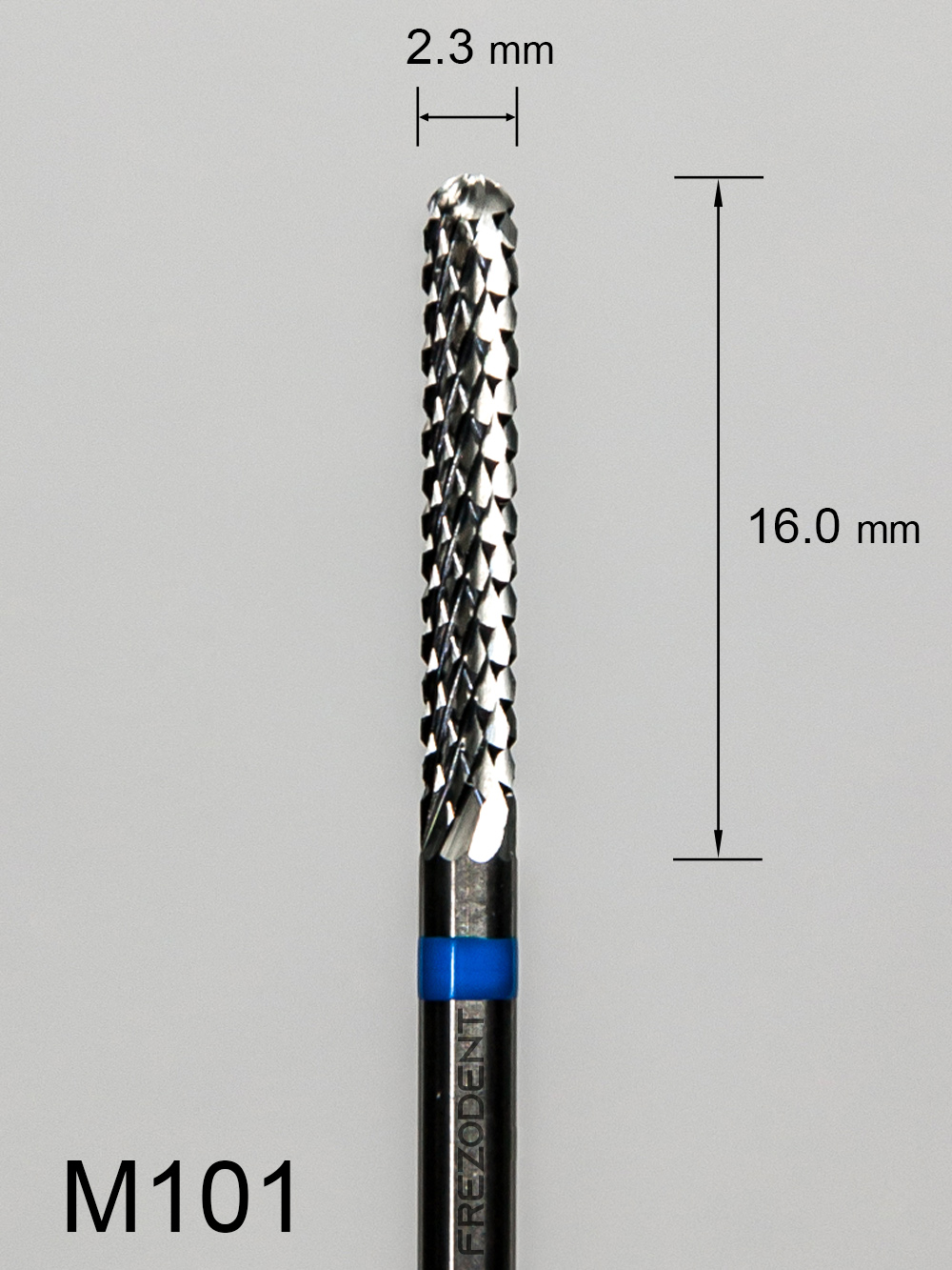 Profesjonalny frez protetyczny o niezwykle smukłej konstrukcji, stworzony do zaawansowanej i precyzyjnej pracy w technice dentystycznej. Model M101 posiada krzyżowe średnie nacięcie (oznaczone niebieskim paskiem), które zapewnia kontrolowane i stabilne skrawanie twardych materiałów, minimalizując wibracje. Bardzo mała średnica robocza (2,3 mm) w połączeniu z wyjątkowo długą częścią roboczą (16,0 mm) czyni go idealnym narzędziem do docierania do głębokich i wąskich obszarów.Dzięki walcowemu kształtowi z zaokrąglonym końcem, ten frez do metalu i akrylu jest niezastąpiony przy opracowywaniu wąskich bruzd, formowaniu wewnętrznych ścianek oraz wygładzaniu krawędzi bez ostrych przejść. Jest to kluczowe narzędzie do obróbki detali i długich, prostych powierzchni.