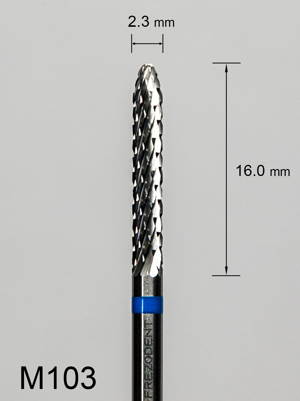 Frez węglikowy M103 z krzyżowym średnim nacięciem (niebieski pasek) – kształt walcowy ze zwężającym się czubkiem.