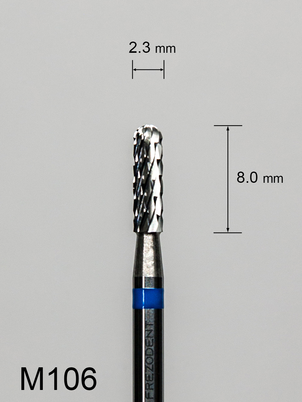Profesjonalny frez protetyczny o smukłej i kompaktowej konstrukcji, stworzony do bardzo precyzyjnej pracy w ograniczonej przestrzeni w technice dentystycznej. Model M106 posiada krzyżowe średnie nacięcie (oznaczone niebieskim paskiem), które zapewnia kontrolowane i stabilne skrawanie twardych materiałów, minimalizując wibracje. Mała średnica robocza (2,3 mm) w połączeniu z krótką częścią roboczą (8,0 mm) zapewnia maksymalną stabilność i minimalizuje drgania, co jest kluczowe dla precyzyjnego finiszowania detali.Dzięki walcowemu kształtowi z zaokrąglonym końcem, ten frez do metalu i akrylu jest niezastąpiony przy opracowywaniu wąskich bruzd, formowaniu wewnętrznych ścianek oraz wygładzaniu krawędzi bez ostrych przejść w płytkich obszarach.