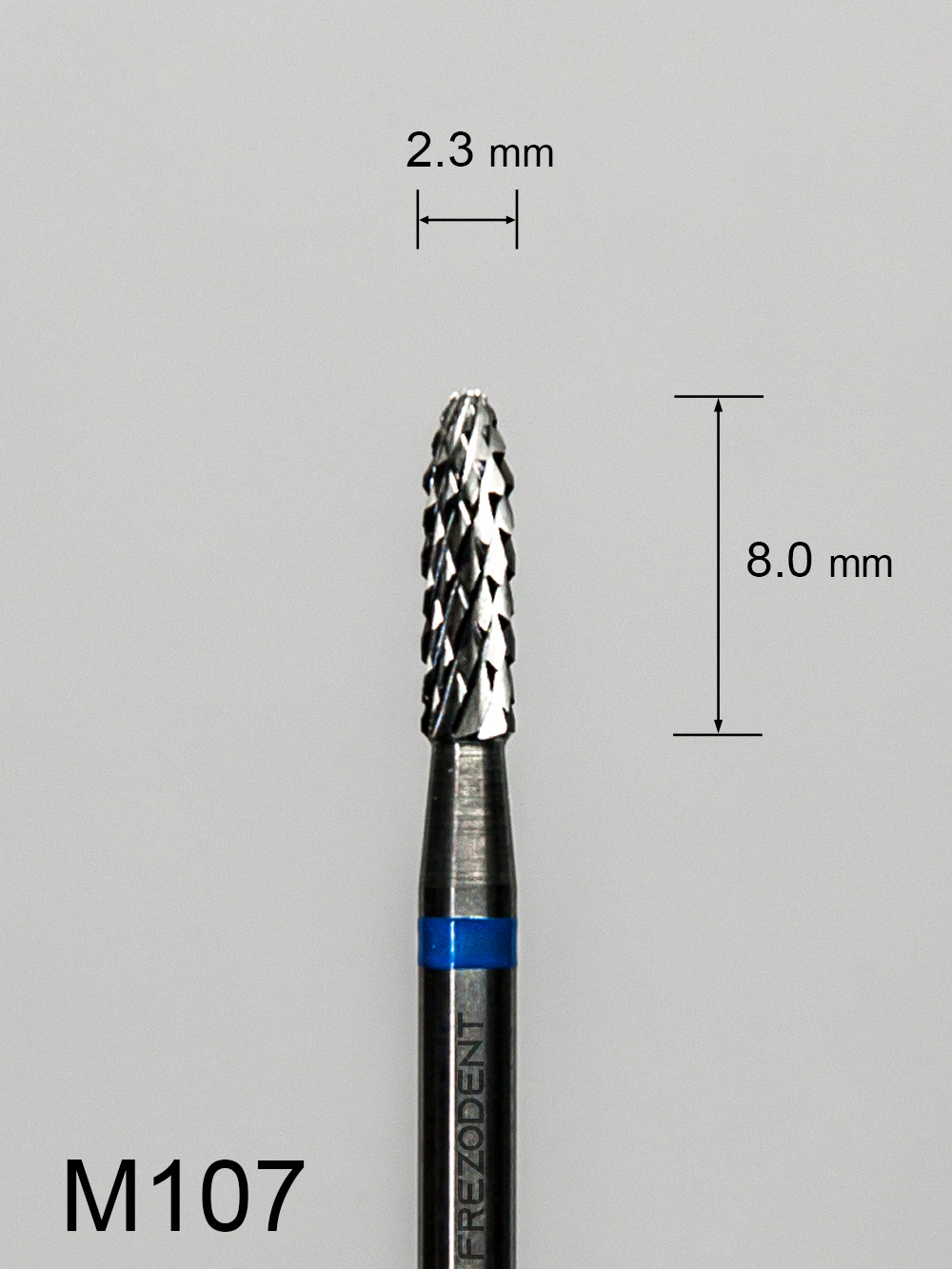 Profesjonalny frez protetyczny o kompaktowej konstrukcji, stworzony do bardzo precyzyjnej pracy w ograniczonej przestrzeni w technice dentystycznej. Model M107 posiada krzyżowe średnie nacięcie (oznaczone niebieskim paskiem), które zapewnia kontrolowane i stabilne skrawanie twardych materiałów, minimalizując wibracje. Mała średnica robocza (2,3 mm) w połączeniu z krótką częścią roboczą (8,0 mm) gwarantuje maksymalną stabilność i minimalizuje drgania, co jest kluczowe dla precyzyjnego finiszowania detali.Dzięki walcowemu kształtowi ze zwężającym się czubkiem, ten frez do metalu i akrylu jest niezastąpiony przy opracowywaniu wąskich bruzd, formowaniu wewnętrznych ścianek oraz precyzyjnym konturowaniu detali za pomocą zwężonej końcówki. Doskonały do pracy, gdzie liczy się precyzja i stabilność.