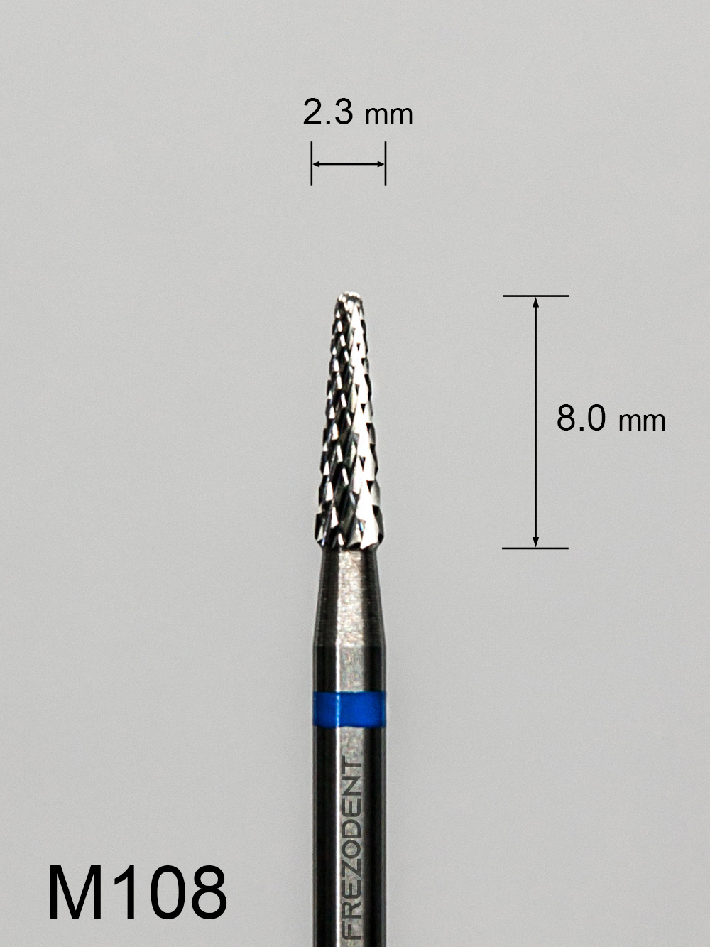 Profesjonalny frez protetyczny o kompaktowej konstrukcji, stworzony do precyzyjnej i stabilnej pracy w technice dentystycznej. Model M108 posiada krzyżowe średnie nacięcie (oznaczone niebieskim paskiem), które zapewnia efektywne i kontrolowane skrawanie twardych materiałów, takich jak stopy metalowe i akryl. Miniaturowa średnica robocza (2,3 mm) w połączeniu z krótką częścią roboczą (8,0 mm) zapewnia maksymalną stabilność i minimalizuje drgania, co jest kluczowe dla delikatnej i precyzyjnej obróbki.Dzięki stożkowemu kształtowi, ten frez do metalu i akrylu jest niezastąpiony przy opracowywaniu wąskich bruzd, precyzyjnym nacinaniu oraz wykańczaniu krawędzi i kątów w ograniczonych obszarach. Jego geometria ułatwia tworzenie skośnych powierzchni i idealnych przejść.