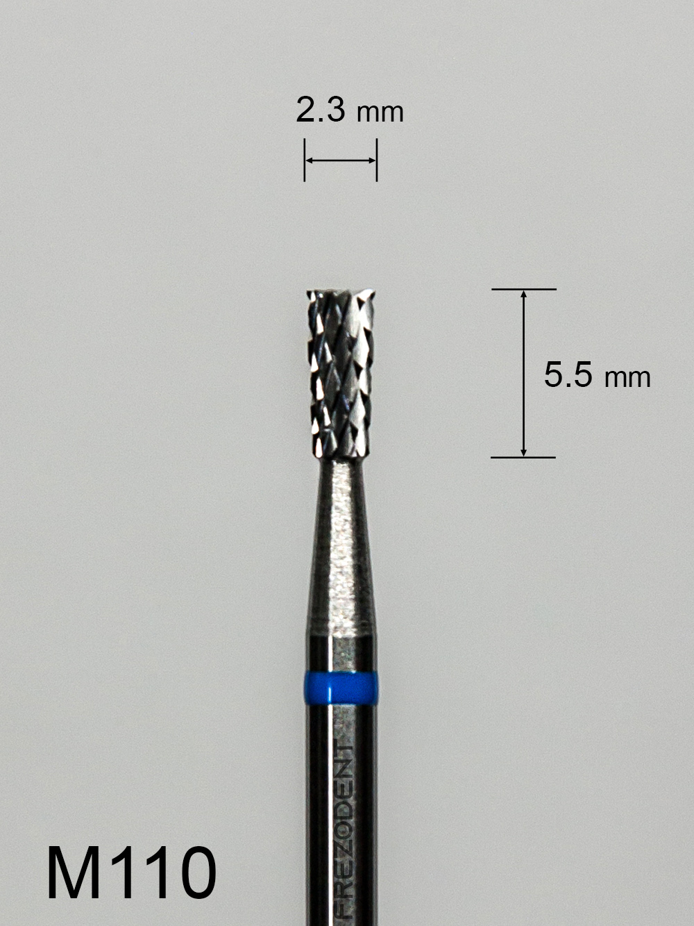 Profesjonalny frez protetyczny o kompaktowej budowie i unikatowym kształcie, stworzony do precyzyjnej obróbki twardych materiałów w technice dentystycznej. Model M110 posiada krzyżowe średnie nacięcie (oznaczone niebieskim paskiem), które zapewnia efektywne i stabilne skrawanie, minimalizując wibracje. Miniaturowa średnica robocza (2,3 mm) w połączeniu z bardzo krótką częścią roboczą (5,5 mm) i kształtem odwróconego stożka czyni go idealnym narzędziem do tworzenia podcięć, schodków i płaskich powierzchni z wyraźnymi kątami.Dzięki odwróconemu kształtowi stożkowemu, ten frez do metalu i akrylu jest niezastąpiony przy opracowywaniu trudnych do osiągnięcia detali, umożliwiając frezowanie pod kątem i precyzyjne wykańczanie krawędzi.