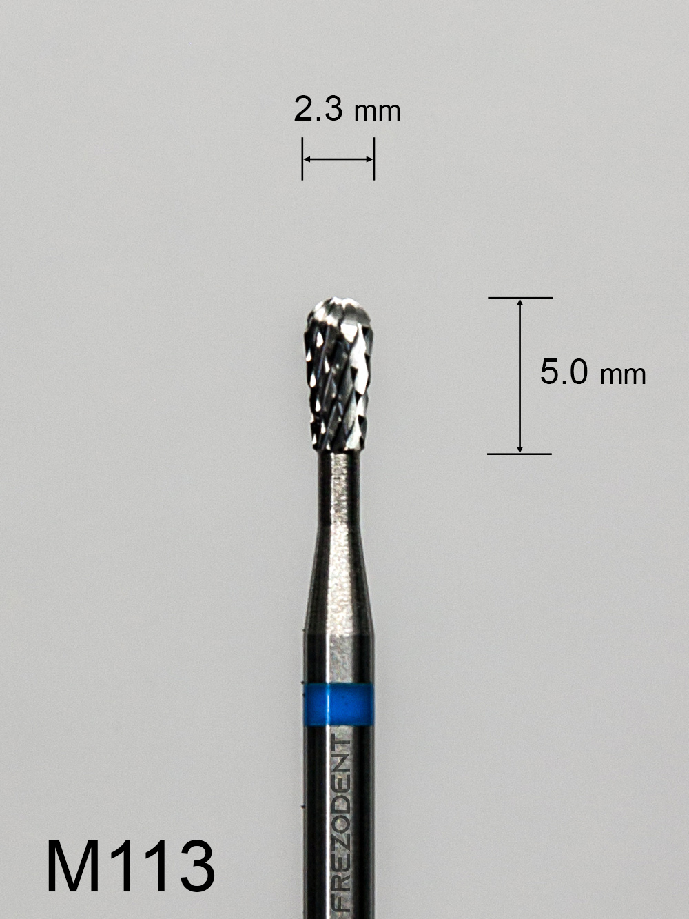 Profesjonalny frez protetyczny o małych wymiarach i charakterystycznym kształcie, stworzony do precyzyjnej obróbki twardych materiałów w technice dentystycznej. Model M113 posiada krzyżowe średnie nacięcie (oznaczone niebieskim paskiem), które zapewnia kontrolowane i stabilne skrawanie, minimalizując wibracje. Kompaktowe wymiary (Ø 2,3 mm w najszerszym miejscu i długość 5,0 mm) gwarantują maksymalną stabilność i kontrolę, co jest kluczowe dla delikatnej i precyzyjnej obróbki w trudno dostępnych miejscach.Dzięki kształtowi odwróconej gruszki (płomienia), ten frez do metalu i akrylu jest niezastąpiony przy tworzeniu precyzyjnych podcięć, rozszerzaniu i wygładzaniu krawędzi ubytków oraz formowaniu wewnętrznych ścianek.