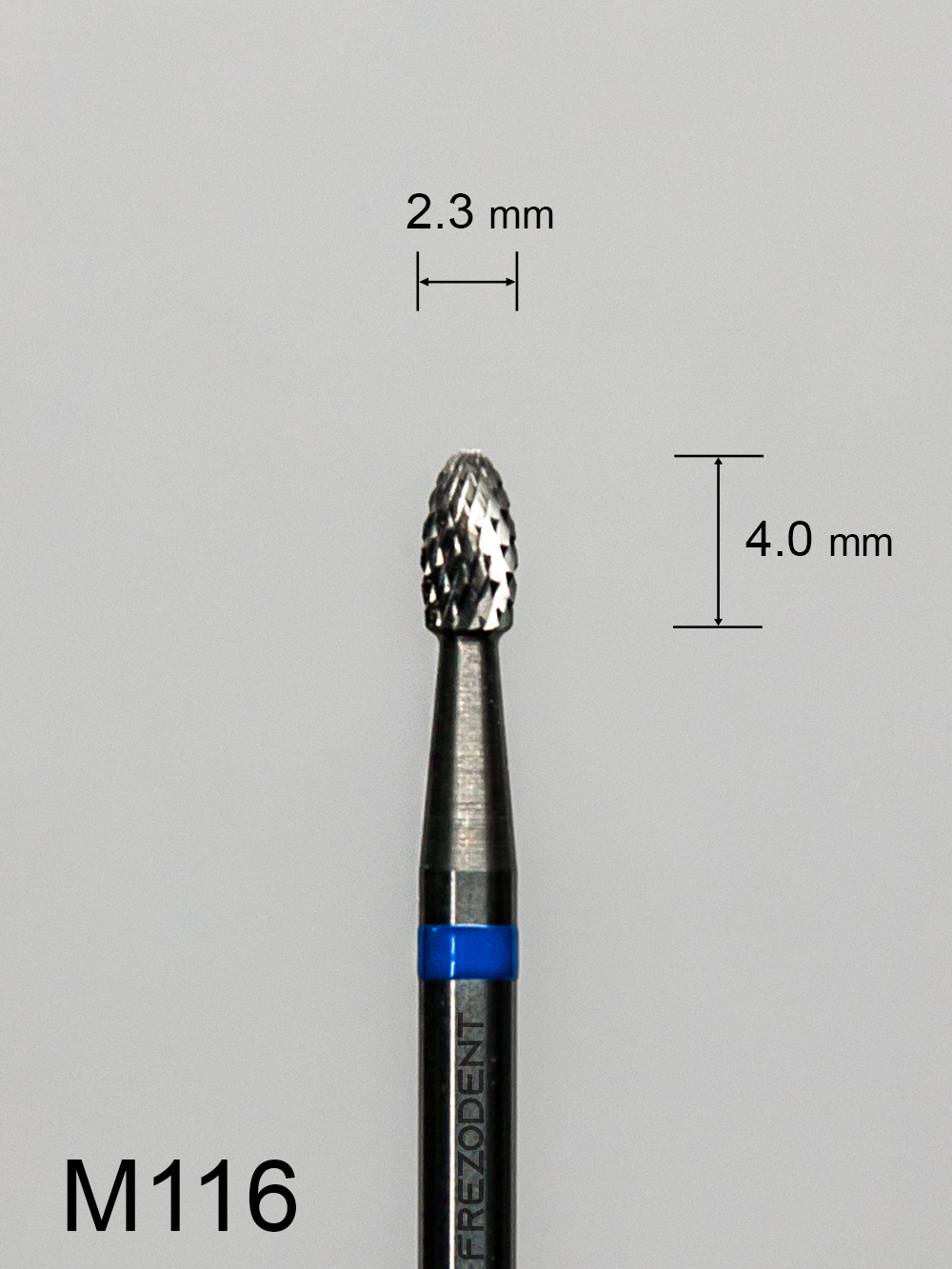 Profesjonalny frez protetyczny o mikroskopijnych wymiarach i zaokrąglonym kształcie, stworzony do najbardziej delikatnych i precyzyjnych prac z twardymi materiałami w technice dentystycznej. Model M116 posiada krzyżowe średnie nacięcie (oznaczone niebieskim paskiem), które zapewnia kontrolowane i stabilne skrawanie, minimalizując wibracje. Dzięki miniaturowej średnicy roboczej (2,3 mm) i bardzo krótkiej części roboczej (4,0 mm), jest to narzędzie o najwyższej stabilności, idealne do pracy w mocno ograniczonych przestrzeniach.Dzięki wypukłemu kształtowi (soczewkowemu), ten frez do metalu i akrylu jest niezastąpiony przy formowaniu małych, zaokrąglonych powierzchni, usuwaniu nadlewów oraz precyzyjnym wykańczaniu detali na krzywiznach. Zapewnia gładkie i estetyczne przejścia.