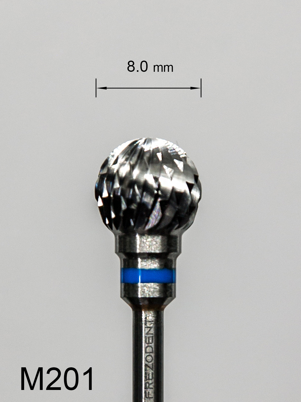 Profesjonalny frez protetyczny o kształcie idealnej kuli i dużej średnicy, stworzony do szybkiej i kontrolowanej obróbki twardych materiałów w technice dentystycznej. Model M201 posiada krzyżowe średnie nacięcie (oznaczone niebieskim paskiem), które zapewnia agresywne, ale stabilne skrawanie, minimalizując ryzyko zapychania się. Duża średnica robocza (8,0 mm) gwarantuje maksymalną wydajność przy usuwaniu znacznych ilości materiału z jednego przejazdu.Dzięki kulistemu kształtowi (8 mm), ten frez do metalu i akrylu jest niezastąpiony przy opracowywaniu zagłębień, poszerzaniu ubytków oraz modelowaniu płynnych, anatomicznych krzywizn w podbudowach metalowych i akrylowych. Zapewnia gładkie wykończenie wewnętrznych powierzchni.