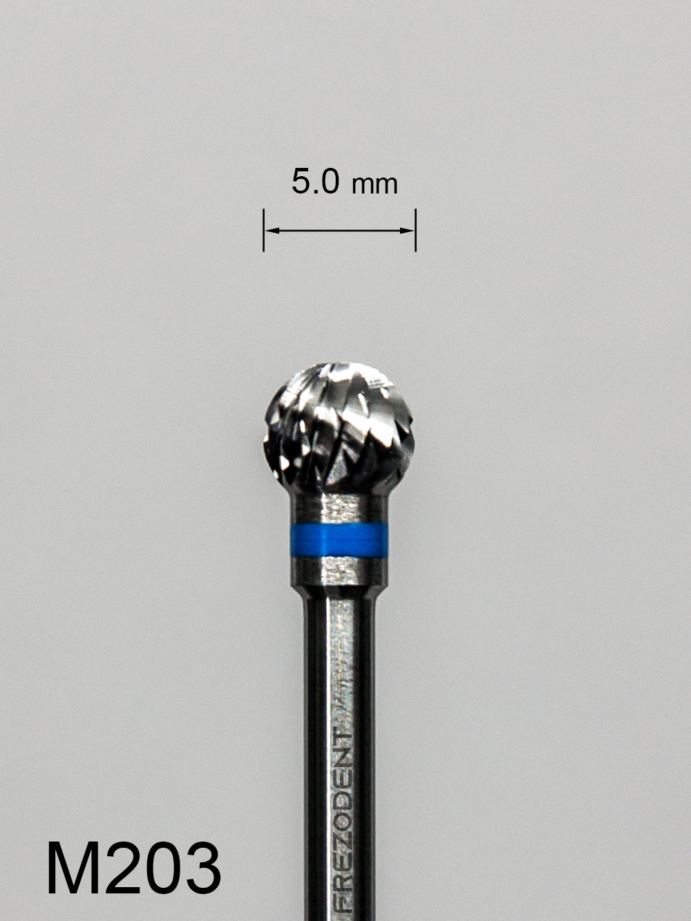 Profesjonalny frez protetyczny o kształcie idealnej kuli i średnicy 5 mm, stworzony do szybkiej i kontrolowanej obróbki twardych materiałów w technice dentystycznej. Model M203 posiada krzyżowe średnie nacięcie (oznaczone niebieskim paskiem), które zapewnia efektywne i stabilne skrawanie, minimalizując ryzyko zapychania się. Średnica robocza (5,0 mm) gwarantuje dobrą wydajność przy usuwaniu materiału i jednocześnie pozwala na większą precyzję niż większe frezy kuliste, co jest kluczowe w modelowaniu detali.Dzięki kulistemu kształtowi (5 mm), ten frez do metalu i akrylu jest niezastąpiony przy opracowywaniu zagłębień, gniazd pod zasuwy, poszerzaniu ubytków oraz modelowaniu płynnych, anatomicznych krzywizn w podbudowach metalowych i akrylowych.