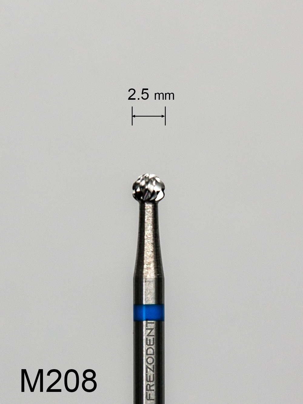 Profesjonalny frez protetyczny o kształcie idealnej kuli i małej średnicy, stworzony do najbardziej precyzyjnej i kontrolowanej obróbki twardych materiałów w technice dentystycznej. Model M208 posiada krzyżowe średnie nacięcie (oznaczone niebieskim paskiem), które zapewnia efektywne i stabilne skrawanie, minimalizując ryzyko zapychania się. Miniaturowa średnica robocza (2,5 mm) gwarantuje wyjątkową precyzję niezbędną do modelowania bardzo drobnych detali oraz do opracowywania niewielkich zagłębień, gdzie wymagana jest maksymalna kontrola i minimalny rozmiar narzędzia.Dzięki kulistemu kształtowi (2,5 mm), ten frez do metalu i akrylu jest niezastąpiony przy opracowywaniu gniazd, formowaniu retencyjnych zagłębień oraz modelowaniu precyzyjnych, kulistych krzywizn w podbudowach metalowych i akrylowych.