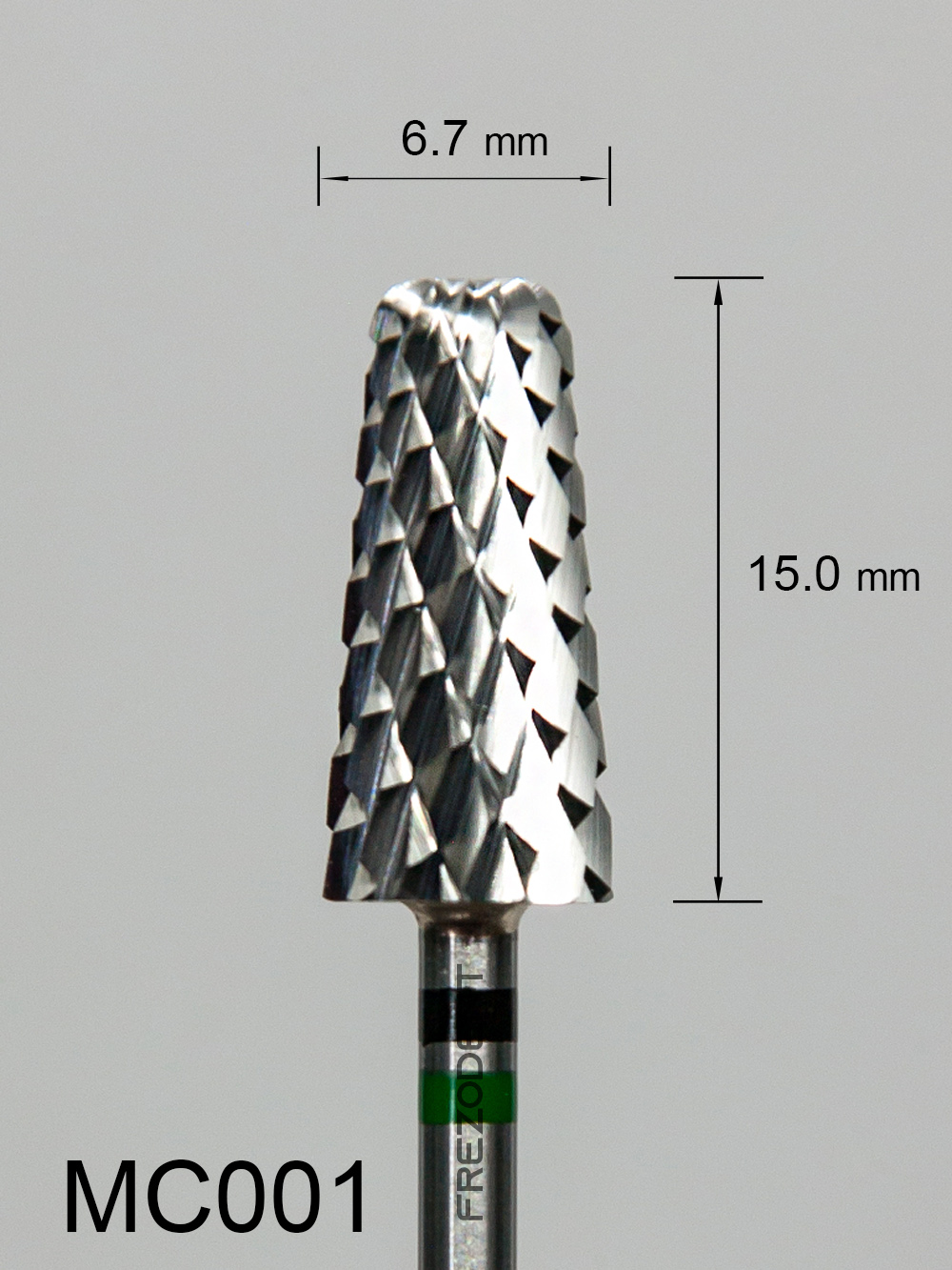 Profesjonalny frez dentystyczny z bardzo wysokiej jakości węglika spiekanego, przeznaczony do pracy w technice protetycznej i dentystycznej. Model MC001 charakteryzuje się średnio-grubym krzyżowym nacięciem (oznaczone paskiem zielono-czarnym), które gwarantuje wydajne usuwanie materiału przy zachowaniu pewnej delikatności i bezpieczeństwa cięcia – frez ten pozycjonowany jest pomiędzy niebieskim a zielonym nacięciem. Stożkowy kształt zapewnia optymalne prowadzenie i jest idealny do wstępnej obróbki akrylu oraz bezpiecznego i kontrolowanego modelowania gipsu bez ryzyka pęknięć.Zastosowanie: