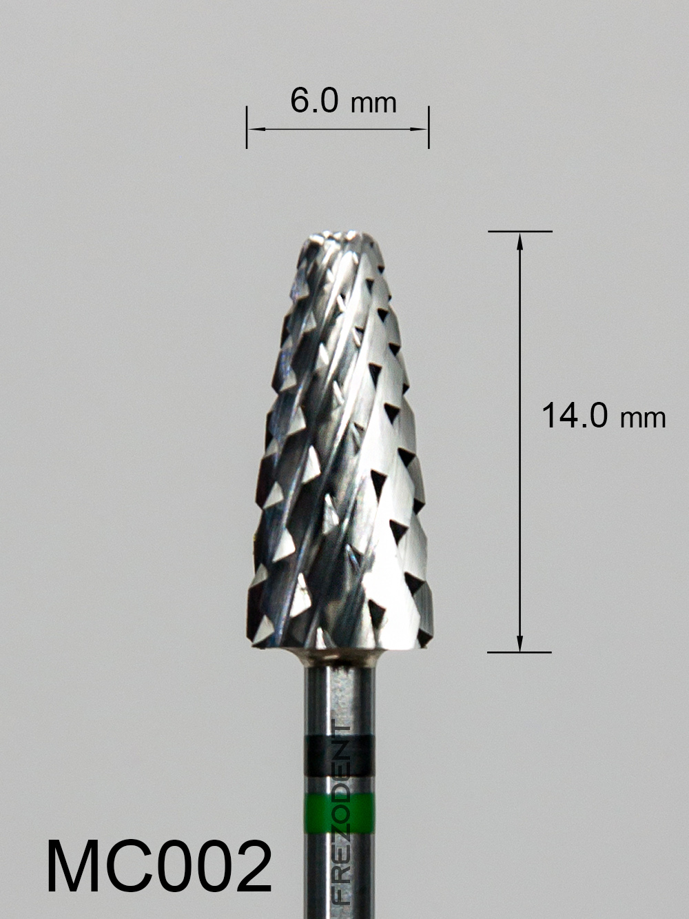 Profesjonalny frez dentystyczny wykonany z wysokiej jakości węglika spiekanego. Frezy te są niezbędne w technice protetycznej do skutecznej i kontrolowanej obróbki twardych materiałów. Model MC002 posiada średnio-grube krzyżowe nacięcie (oznaczone paskiem zielono-czarnym), które efektywnie usuwa masę materiału przy zachowaniu lepszej kontroli niż frezy gruboziarniste. Nacięcie to jest idealnym kompromisem między agresywnością a precyzją. Kształt wypukły (soczewkowy) jest zoptymalizowany do opracowywania dużych, zaokrąglonych konturów i powierzchni wewnętrznych, zapewniając szybkie wygładzenie bez pozostawiania ostrych krawędzi.Zastosowanie:
