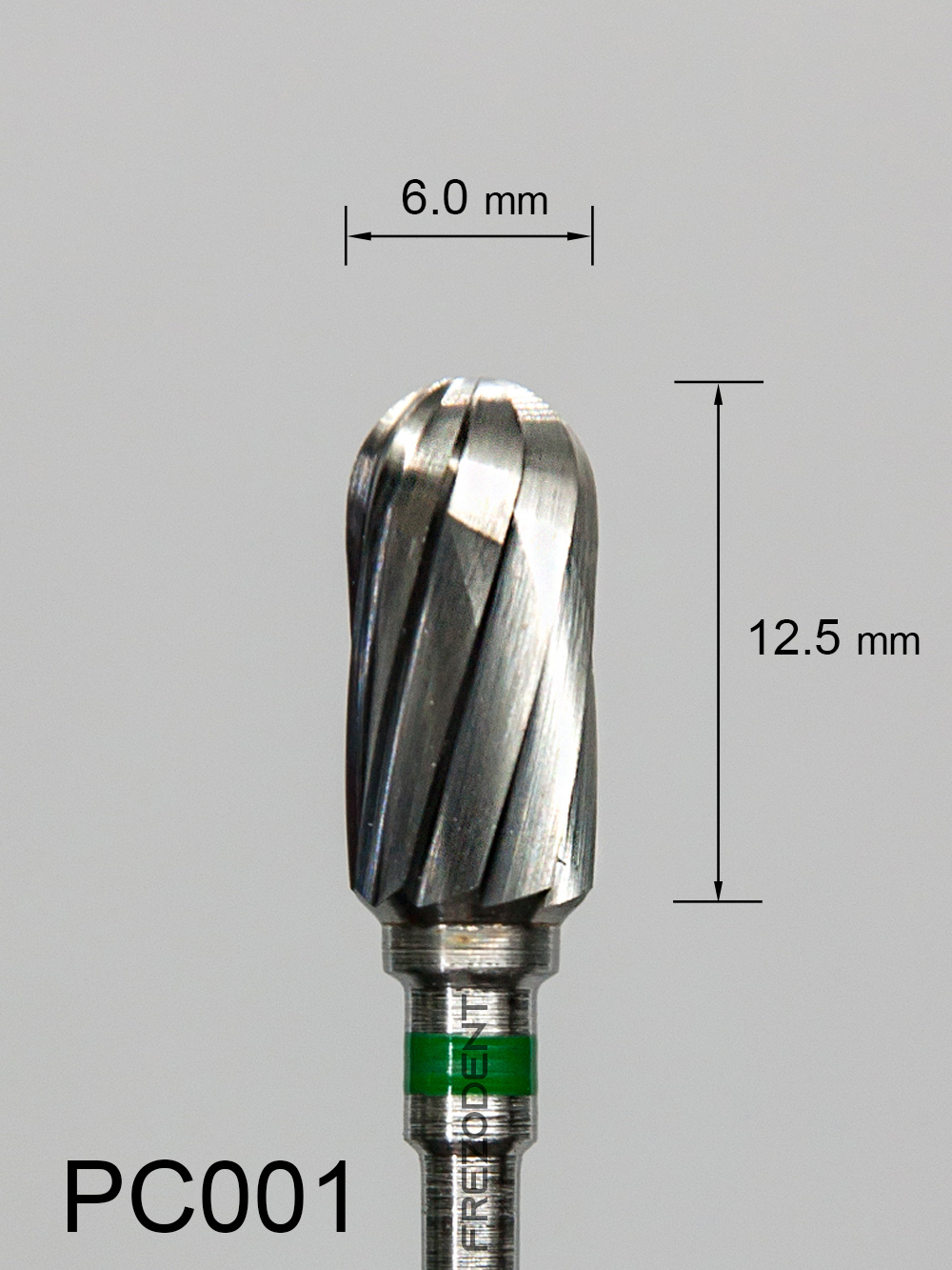 Frez węglikowy PC001 walcowaty z zaokrąglonym końcem z grubym pojedynczym nacięciem (zielony pasek) to narzędzie do obróbki w technice dentystycznej. Nacięcie pojedyncze zapewnia mniejsze drgania i gładsze wykończenie powierzchni w porównaniu do nacięcia krzyżowego.