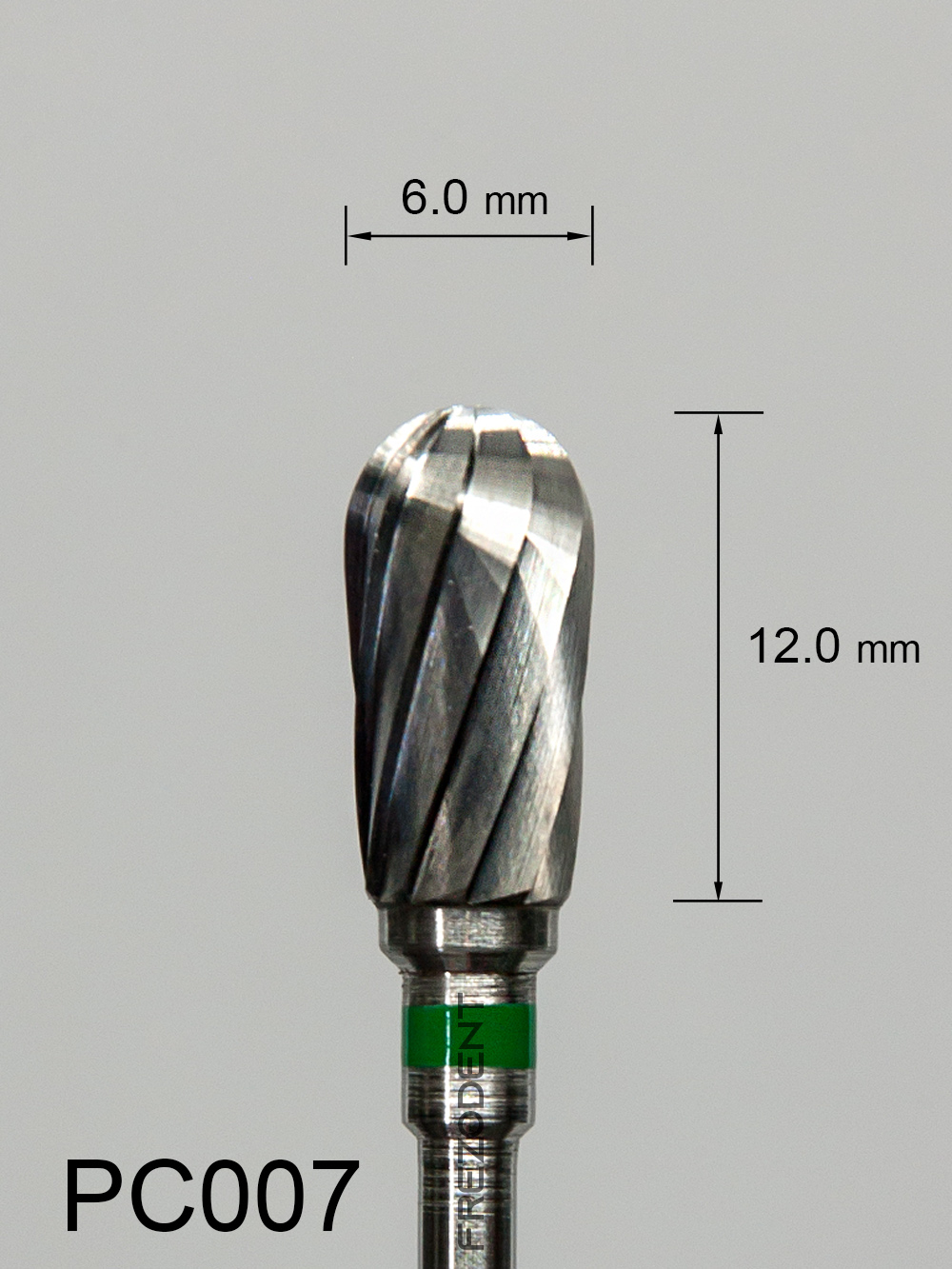 Frez węglikowy PC007 odwróconej gruszki z grubym pojedynczym nacięciem (zielony pasek) to narzędzie do obróbki w technice dentystycznej. Nacięcie pojedyncze zapewnia mniejsze drgania i gładsze wykończenie powierzchni w porównaniu do nacięcia krzyżowego.