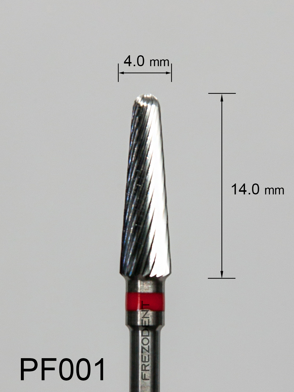 Frez węglikowy PF001 stożkowy z drobnym pojedynczym nacięciem (czerwony pasek) to narzędzie do obróbki w technice dentystycznej. Nacięcie pojedyncze zapewnia mniejsze drgania i gładsze wykończenie powierzchni w porównaniu do nacięcia krzyżowego.