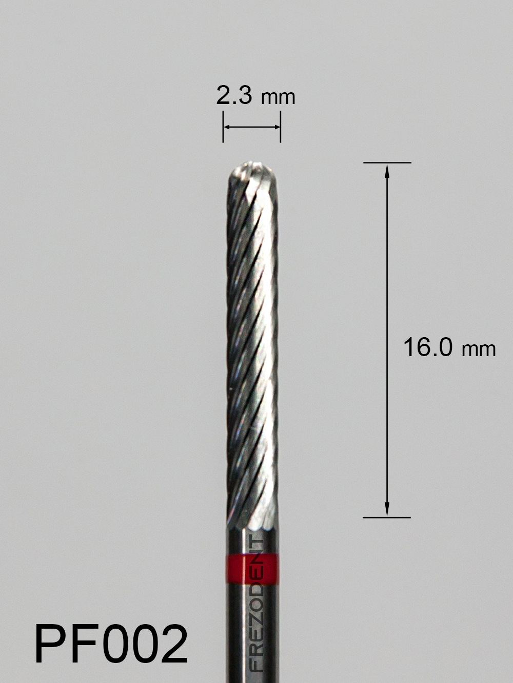 Frez węglikowy PF002 walcowaty z zaokrąglonym końcem z drobnym pojedynczym nacięciem (czerwony pasek) to narzędzie do obróbki w technice dentystycznej. Nacięcie pojedyncze zapewnia mniejsze drgania i gładsze wykończenie powierzchni w porównaniu do nacięcia krzyżowego.