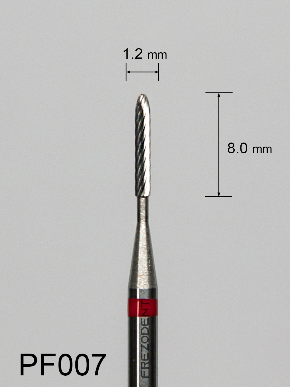Frez węglikowy PF007 walcowaty z zwężającym się końcem z drobnym pojedynczym nacięciem (czerwony pasek) to narzędzie do obróbki w technice dentystycznej. Nacięcie pojedyncze zapewnia mniejsze drgania i gładsze wykończenie powierzchni w porównaniu do nacięcia krzyżowego.