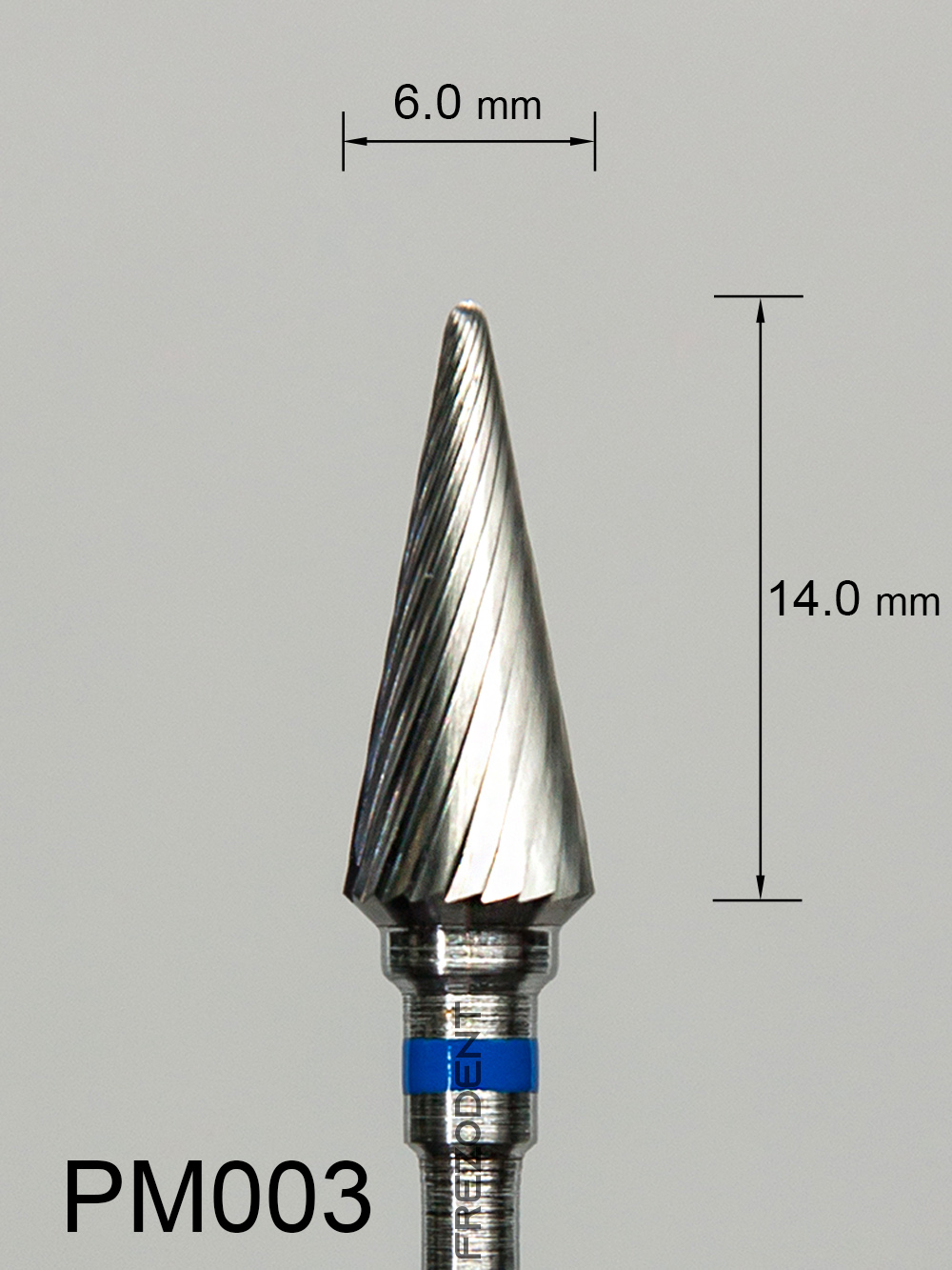 Frez węglikowy PM003 stożkowy z średnim pojedynczym nacięciem (niebieski pasek) to narzędzie do obróbki w technice dentystycznej. Nacięcie pojedyncze zapewnia mniejsze drgania i gładsze wykończenie powierzchni w porównaniu do nacięcia krzyżowego.